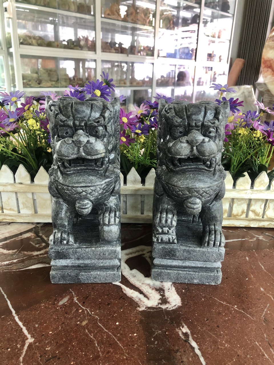 Chất liệu: Đá cẩm thạch đen Kích thước: Dài 22 cm x Rộng 12 cm x Cao 30 cm Khối lượng: 22 kg Chó đá có tên gọi khác là thạch linh cẩu là một