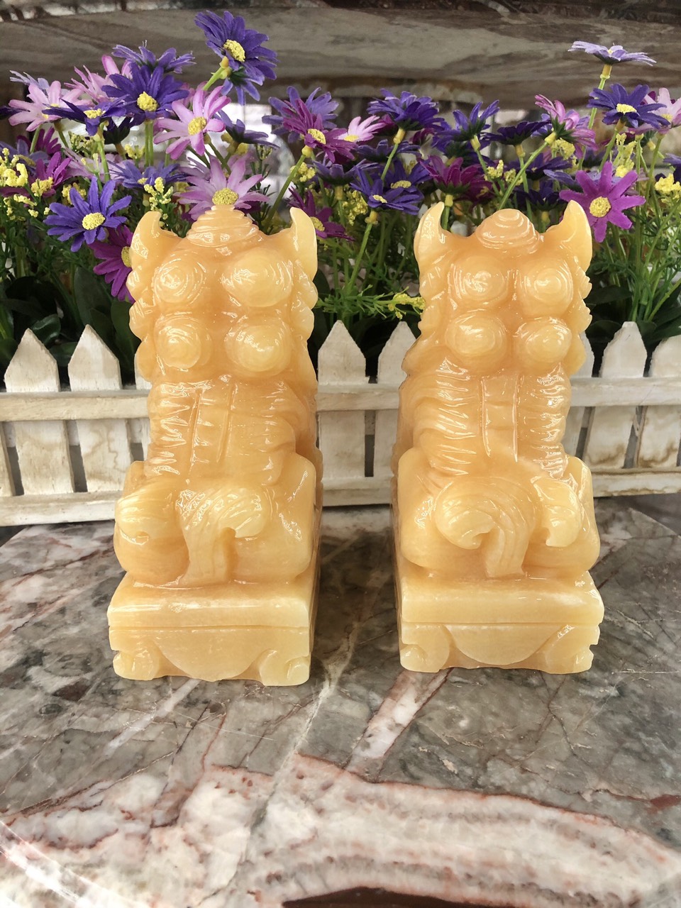 Hợp mệnh Thổ - Kim Chất liệu: Đá cẩm thạch vàng cà rốt Kích thước: Dài 15 cm X Rộng 6 cm x Cao 12,5 cm Khối lượng: 3,2 kg / cặp Ý nghĩa Tỳ