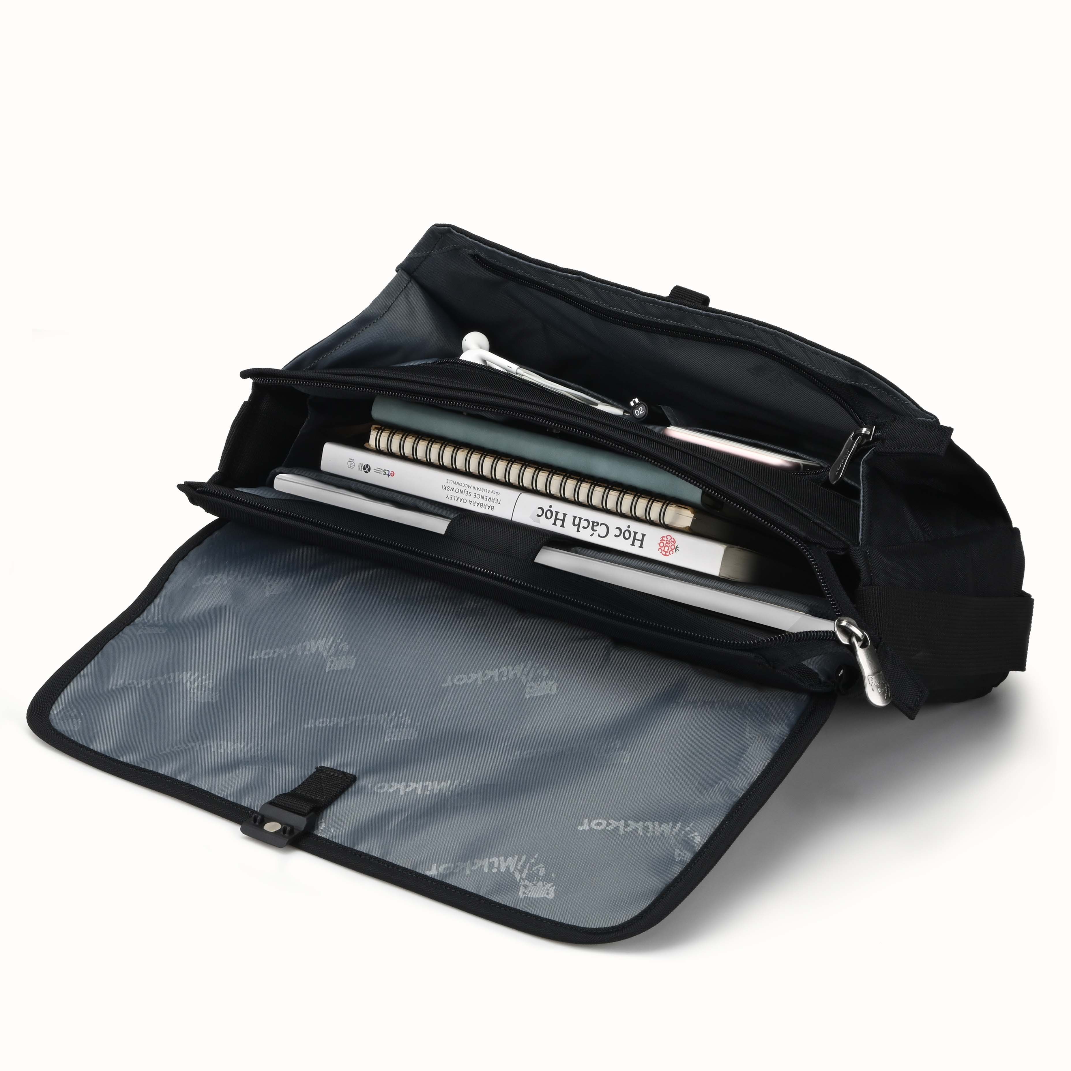 Cặp xách đựng Laptop 15.6 inch chính hãng Mikkor dòng The Mina Messenger Tên sản phẩm: Cặp laptop The Mina 15.6 inch Chất liệu: 600D Supertex PU/2T, 900D Twill Polyester with PU&WR Fit laptop: 15.6 inch Kích thước