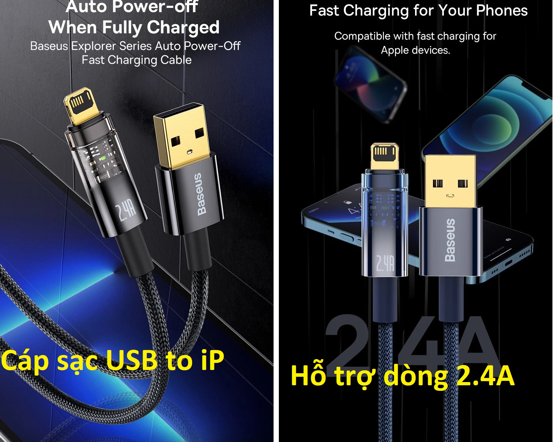 - Chiều dài cáp: 1 Mét - CHÂN CẮM usb ra ip - Dòng sạc tối đa: 5V-3A, SẠC NHANH 3A - Chất liệu: Dây dù, lõi đồng, hợp kim nhôm - Có đèn báo