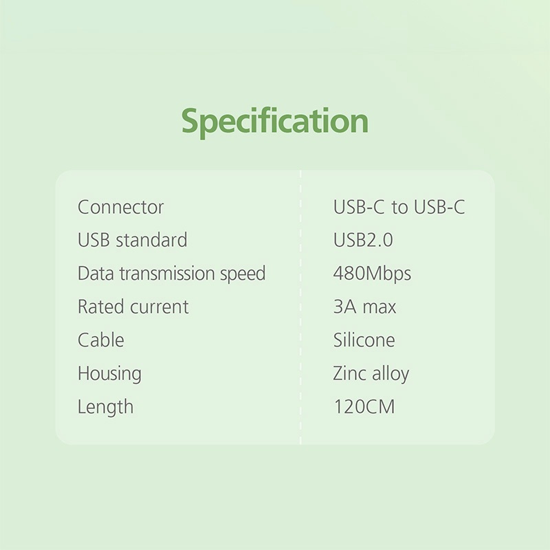 • Chuẩn USB: USB2.0 • Đầu nối: USB-C sang USB-C • Tốc độ truyền dữ liệu: 480Mbps • Dòng điện định mức: tối đa 3A • Cáp: Silicon mềm • Vỏ: Vỏ TPE có mạ