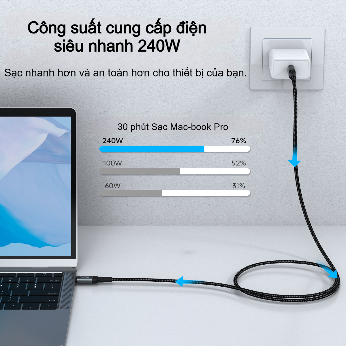 Cáp sạc nhanh 240W, bền bỉ, chịu được hơn 10.000 lần uốn cong, phù hợp cho các thiết bị công suất cao. Thông tin sản phẩm: Công suất: 240W Tốc độ truyền dữ liệu: 480Mbps Chiều