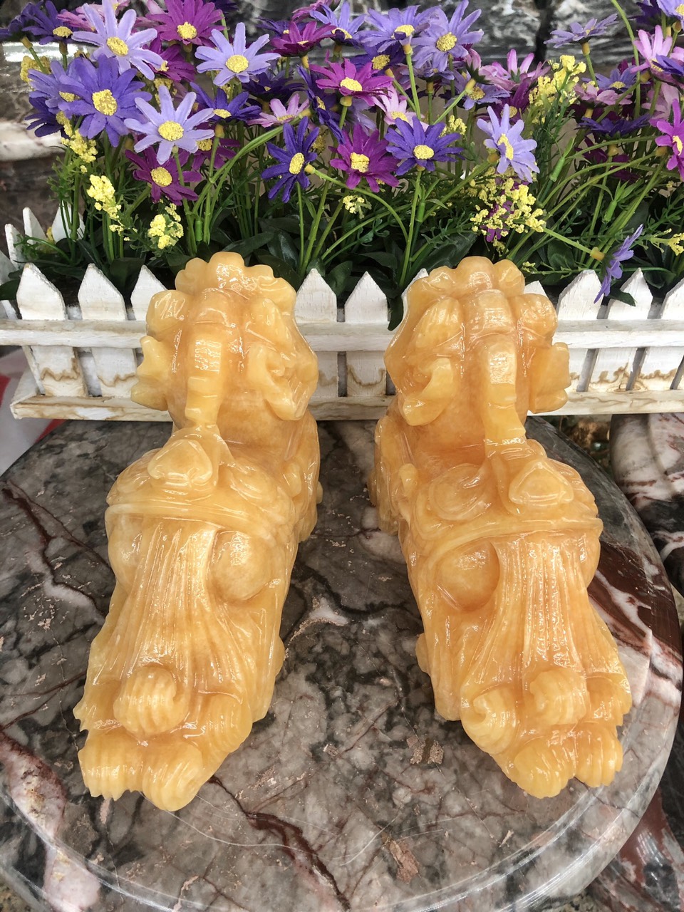 Hợp mệnh Thổ - Kim Chất liệu: Đá cẩm thạch vàng cà rốt Kích thước: Dài 15 cm X Rộng 6 cm x Cao 12,5 cm Khối lượng: 3,2 kg / cặp Ý nghĩa Tỳ
