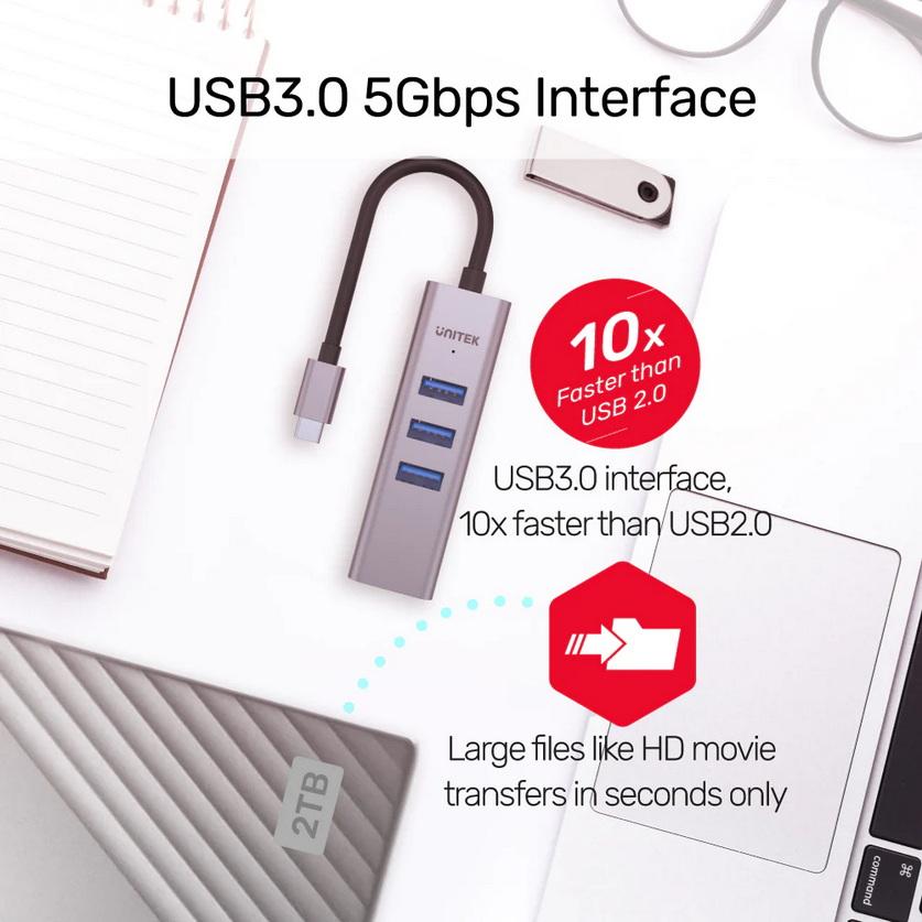 CÁP TYPE-C -> 3 USB 3.0 + LAN UNITEK H1904A TỔNG QUAN SẢN PHẨM : Công suất đầu ra BC1.2 Mở rộng 3 cổng USB với SuperSpeed USB 3.0 5Gbps mạng Ethernet tốc độ cao
