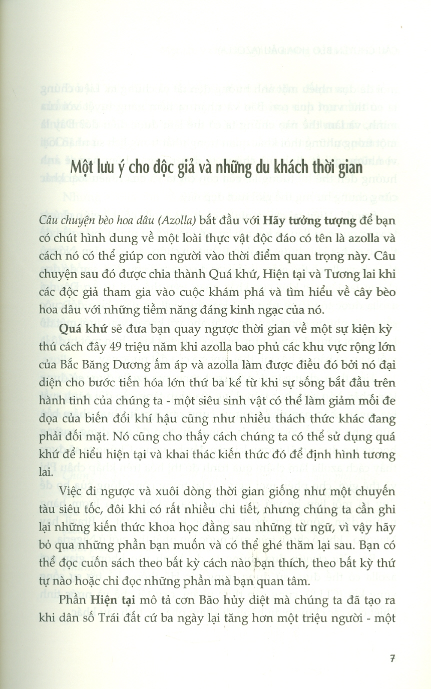 Câu chuyện bèo hoa dâu (Azolla) bắt đầu với Hãy tưởng tượng để bạn có chút hình dung về một loài thực vật độc đáo có tên là azolla và cách nó có thể giúp con người vào thời điểm quan trọng này. Câu chuyện sau đó được chia thành Quá khứ, Hiện tại và Tương lai khi các độc giả tham gia vào cuộc khám phá và tìm hiểu về cây bèo hoa dâu với những tiềm năng đáng kinh ngạc của nó.