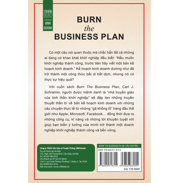 Trong cuốn sách “Burn The Business Plan: Câu chuyện khởi nghiệp từ những gã khổng lồ công nghệ”, Carl J. Schramm, người được mệnh danh là “nhà truyền giáo của tinh thần khởi nghiệp” đã đập tan những truyền thuyết thần bí về bản kế hoạch kinh doanh. Bằng câu chuyện thực tế của những công ty công nghệ hàng đầu như Apple, Microsoft, Facebook…; đồng thời cung cấp bộ công cụ và những lời khuyên đắt giá để giúp bạn xây dựng doanh nghiệp khởi nghiệp thành công; tác phẩm được đánh giá là cuốn sách viết về tư duy khởi nghiệp tân tiến nhất hiện nay.