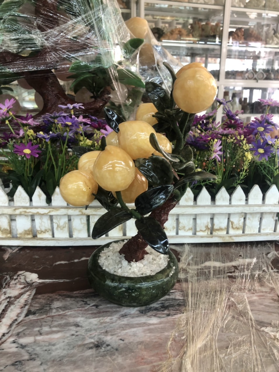 Tượng Cây Đào mới vàng 13 quả canxit vàng tự nhiên cao 40cm x ngang 34cm x sâu 20cm tài lộc hợp ACE mệnh kim thổ Trưng bày phòng khách rất là sang Cây đào