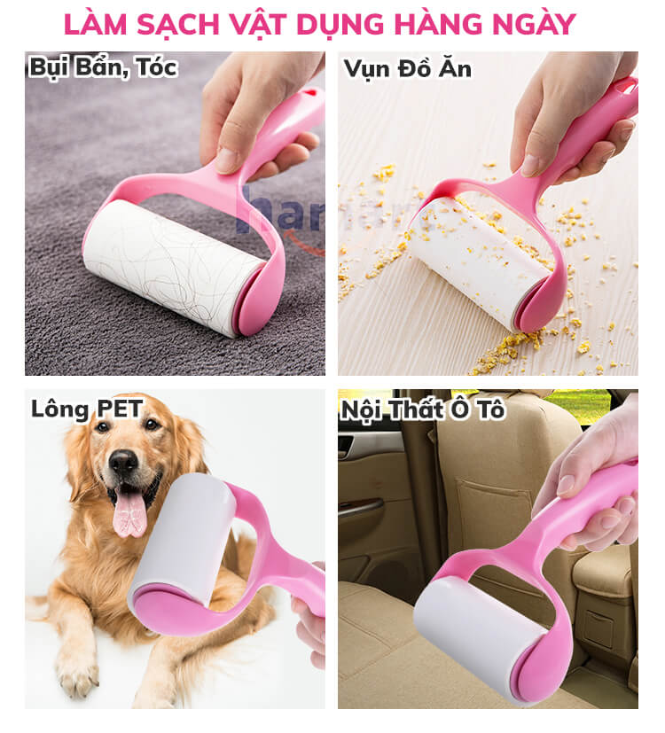 - Cây lăn bụi đa năng làm sạch bằng cách lăn trực tiếp lên bề mặt vải, thảm, chăn ga gối, lăn ghế ô tô, ghế sofa.