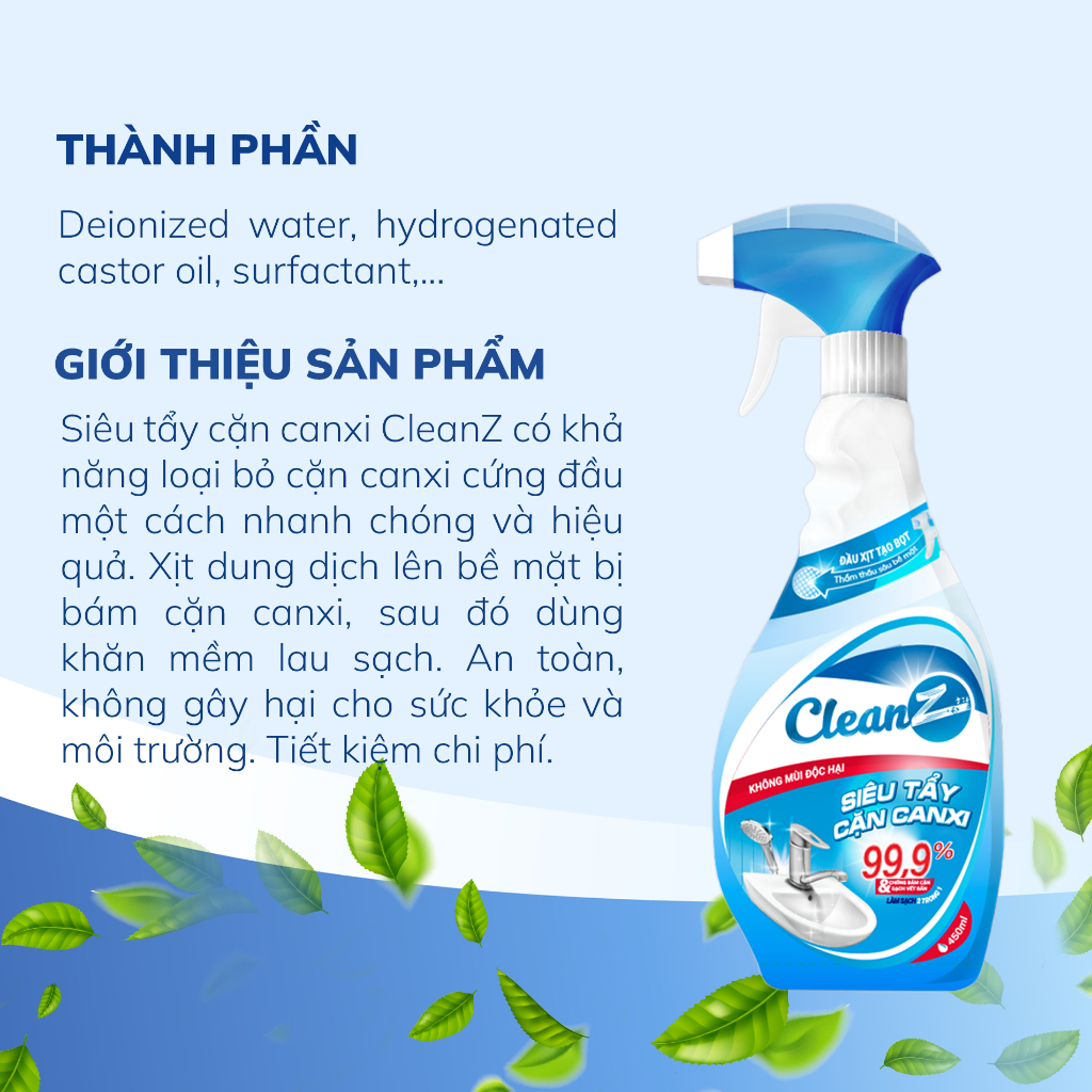 Chai xịt tẩy cặn Canxi CleanZ chống ăn mòn Inox vệ sinh vòi Rửa, vòi sen, vách kính THÔNG TIN CHI TIẾT Chai Xịt Tẩy Cặn Canxi CleanZ Chống Ăn Mòn Inox: