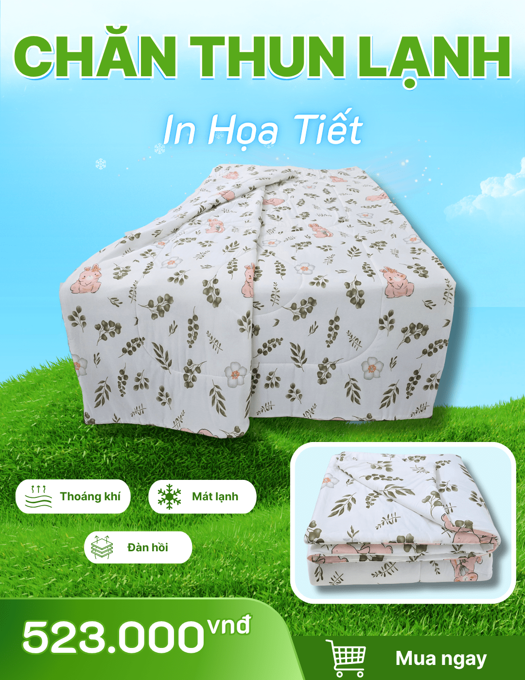 Thông Tin Sản Phẩm: Tên sản phẩm: Chăn chần Thun Lạnh in Họa Tiết Chất liệu vải: 95% Polyester & 5% Spandex Bao bì: Túi PVC quai xách Kích thước sản phẩm: 180cm x 200cm