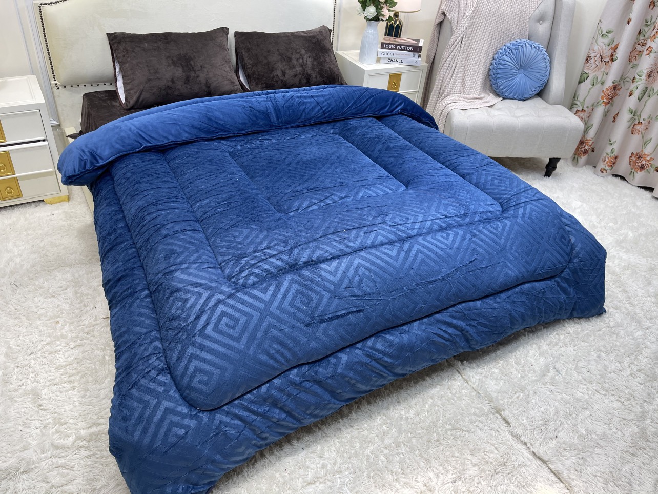Size Queen 248x233cm chuẩn Âu – rộng rãi, ôm trọn giấc ngủ. • Trọng lượng ~2.2kg – siêu nhẹ, siêu êm, cực ấm. • Bề mặt nhung mịn, dày, không bám lông – chạm vào