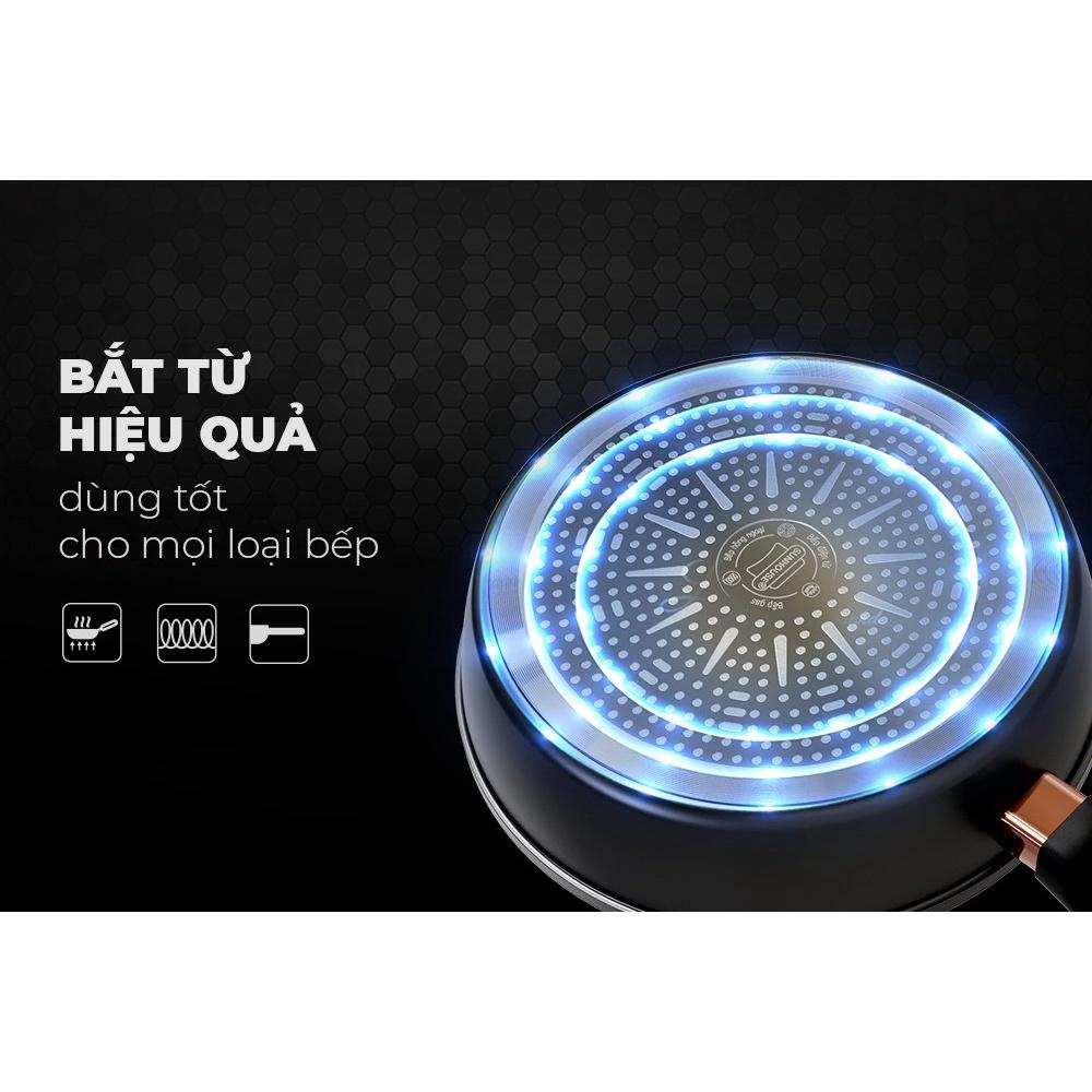 Chất liệu: Nhôm đúc đã được tôi rèn để gia tăng độ bền và tối ưu hóa trọng lượng - Đáy làm bằng thép từ tính dày 4,5mm thiết kế rãnh cho phép dẫn nhiệt