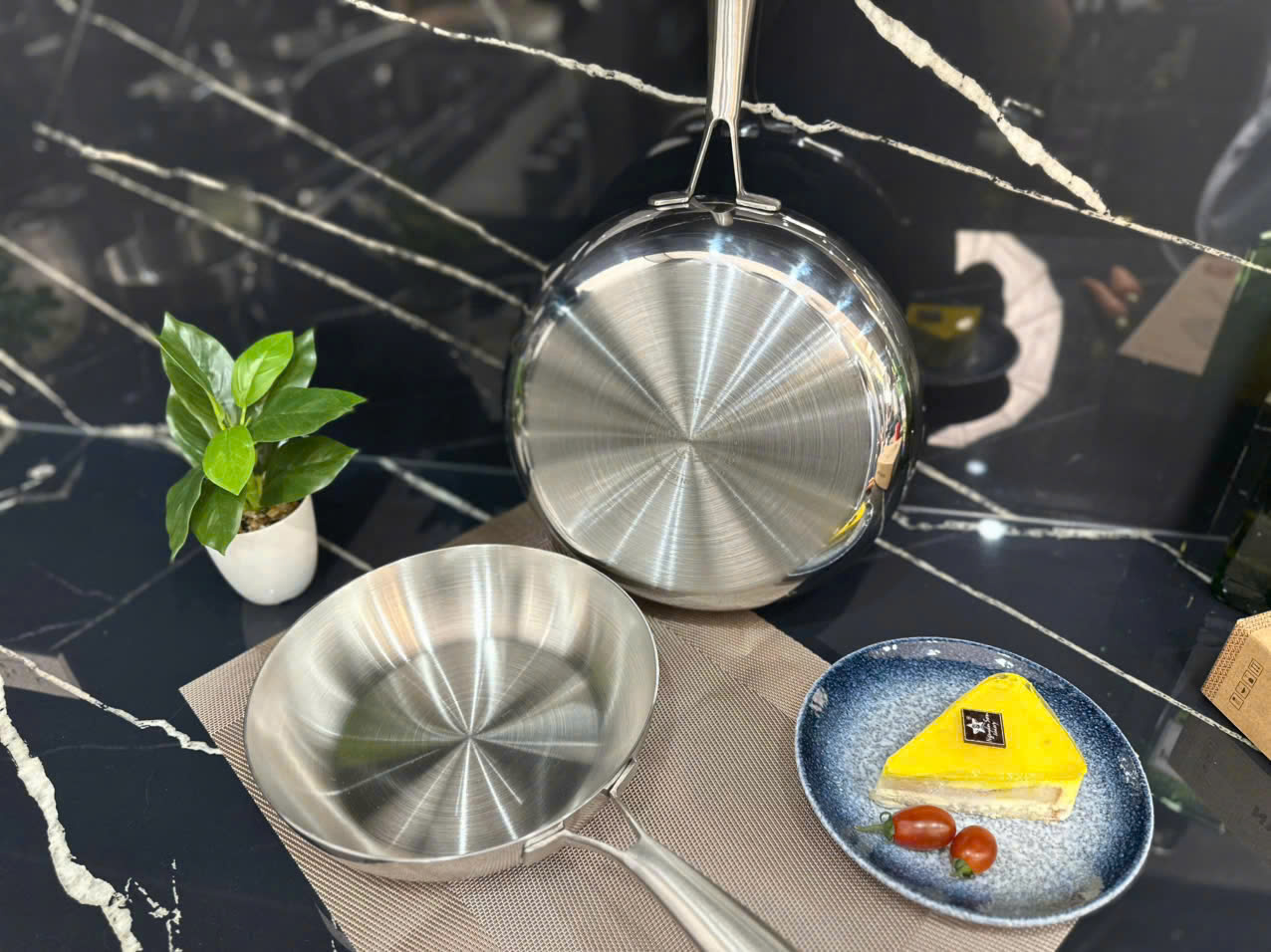 Không sử dụng lớp chống dính, đáy liền nguyên khối dầy dặn, dễ dàng vệ sinh. Không kén bếp, nhiệt lớn, cán chảo inox không bị nóng khi dùng với bếp từ.