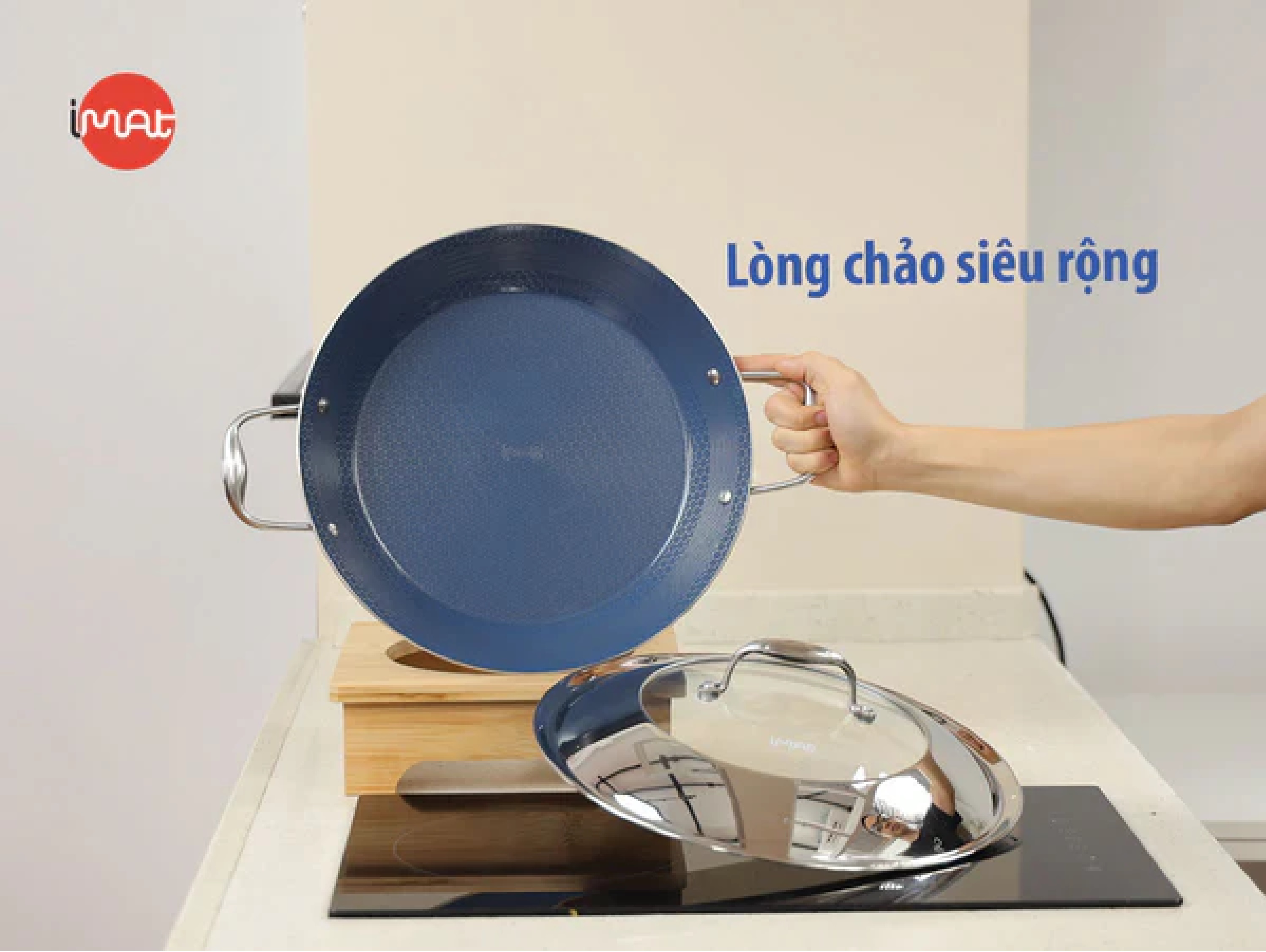 Chảo đa năng iMat Hybrid 32cm là chảo cỡ đại, hai tay cầm. Thích hợp với chiên xào các món lớn, nhiều người ăn. Lòng chảo rộng với công nghệ Blackcube giúp cho các món chiên