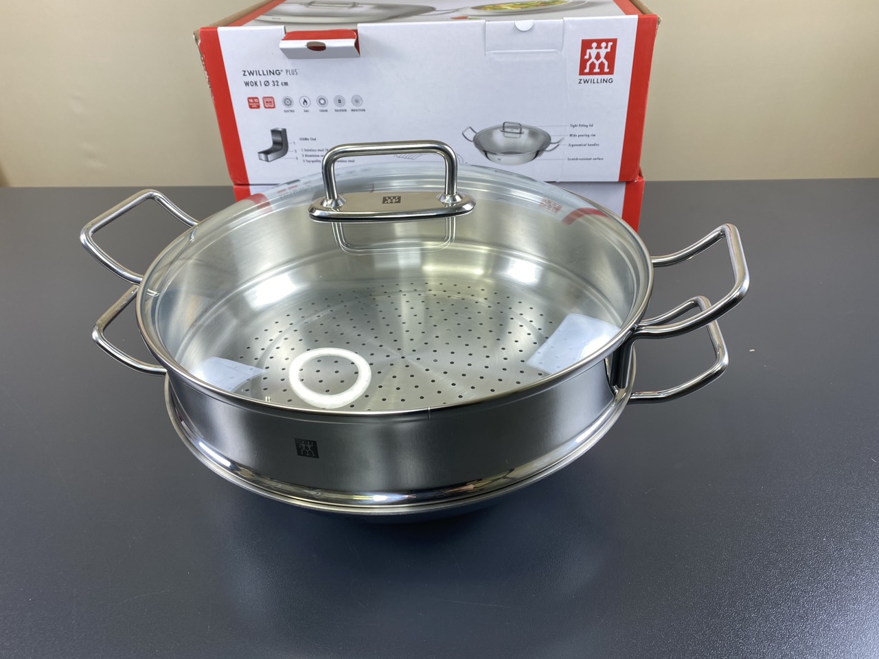 CHẢO TỪ ZWILLING PLUS WOK 32CM có những đặc điểm sau: Chảo từ Zwilling Plus Wok 3 đáy Đường kính: 32cm/ 12,6 inch 1 xửng hấp 32 cm kèm Đường kính đáy: 14cm/ 5,5 inch