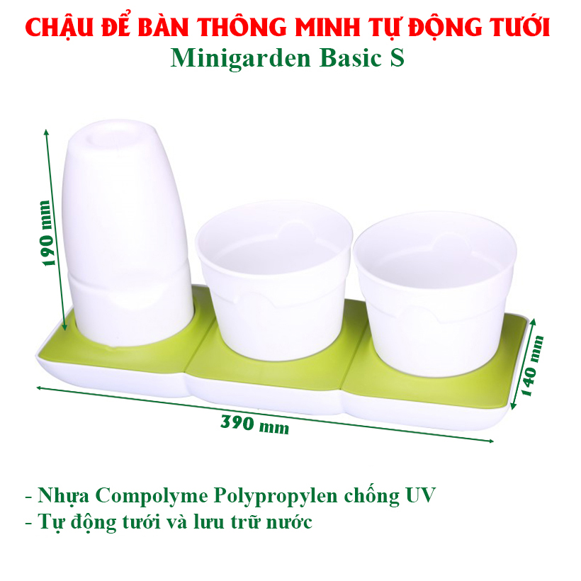 1. CHỨC NĂNG CHẬU TRỒNG CÂY TỰ DƯỠNG BASIC S: - Nhập khẩu: Minigarden Bồ Đào Nha - Chậu trồng cây tự dưỡng Basic S tự động tưới và tự cân bằng độ ẩm cho