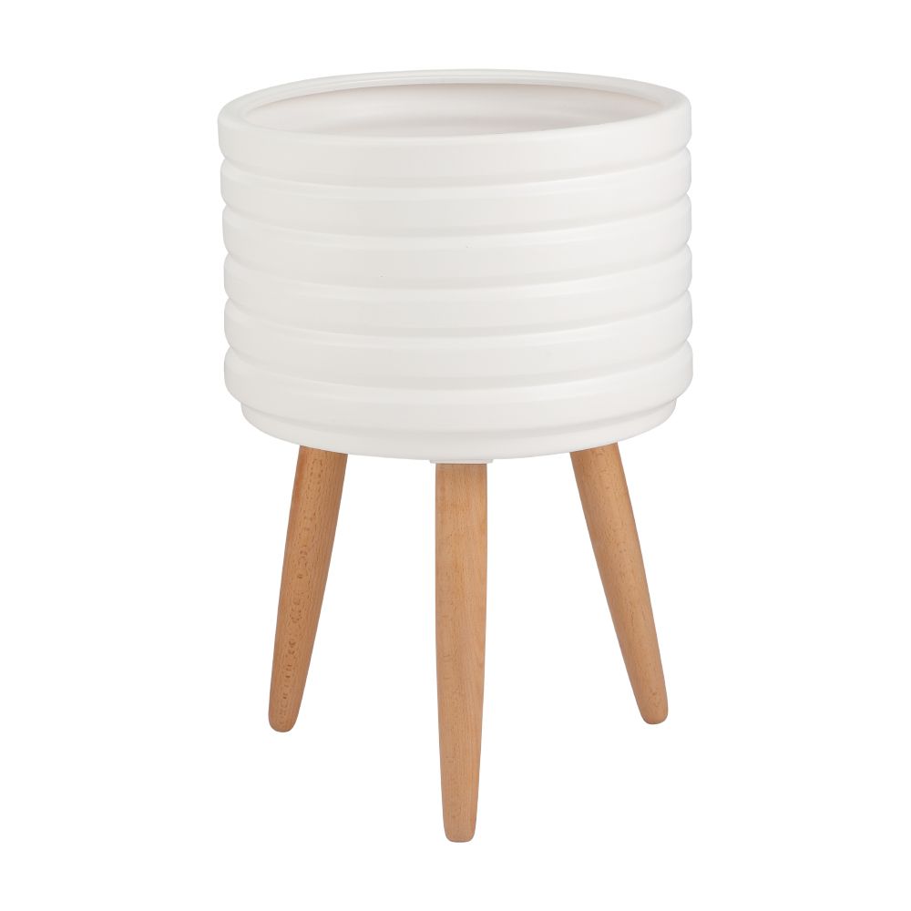 ✨Chậu trang trí bằng sành DEARO hình trụ tròn màu trắng kết hợp chân đỡ bằng gỗ, kích thước 35x50cm (RxC) | Index Living Mall - Phân phối độc quyền tại Việt Nam