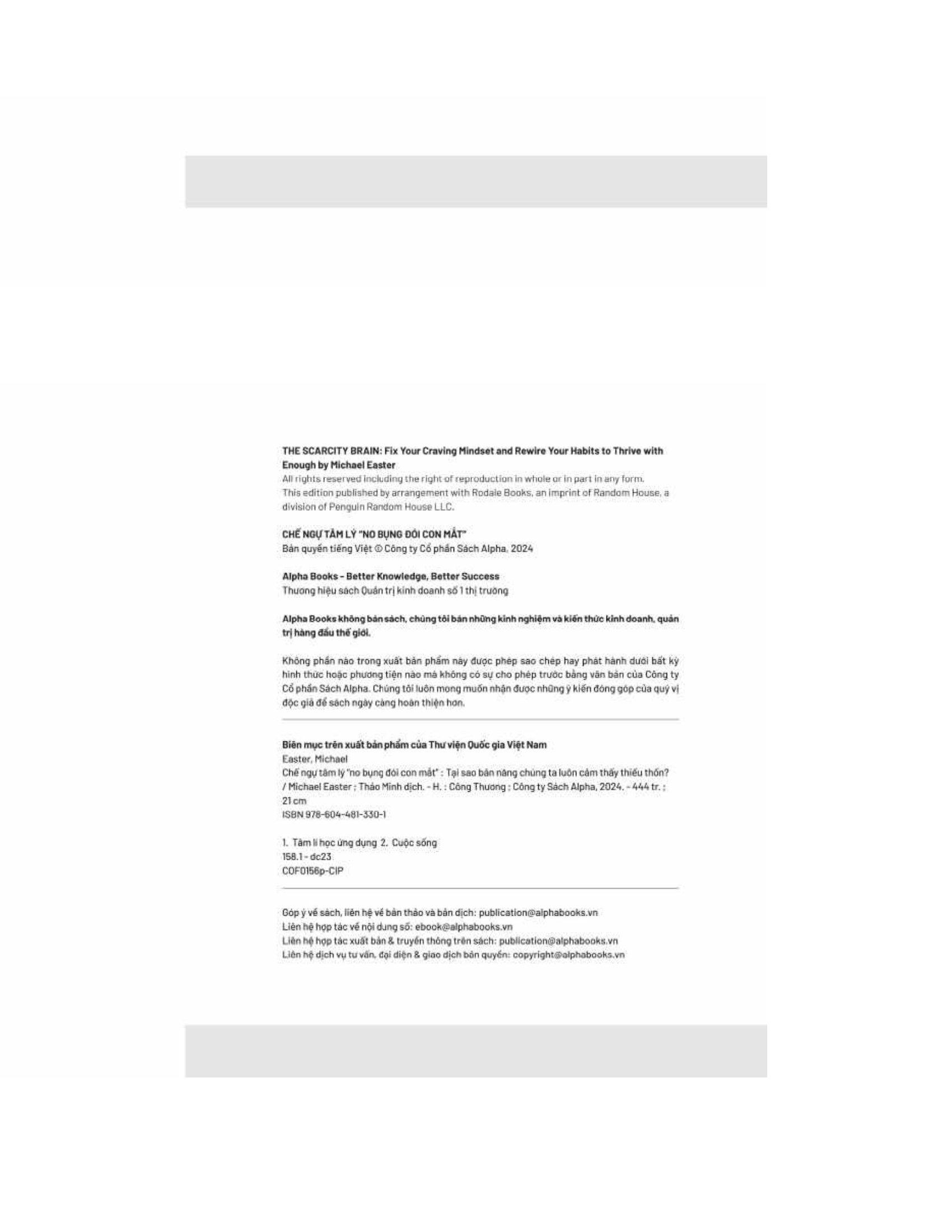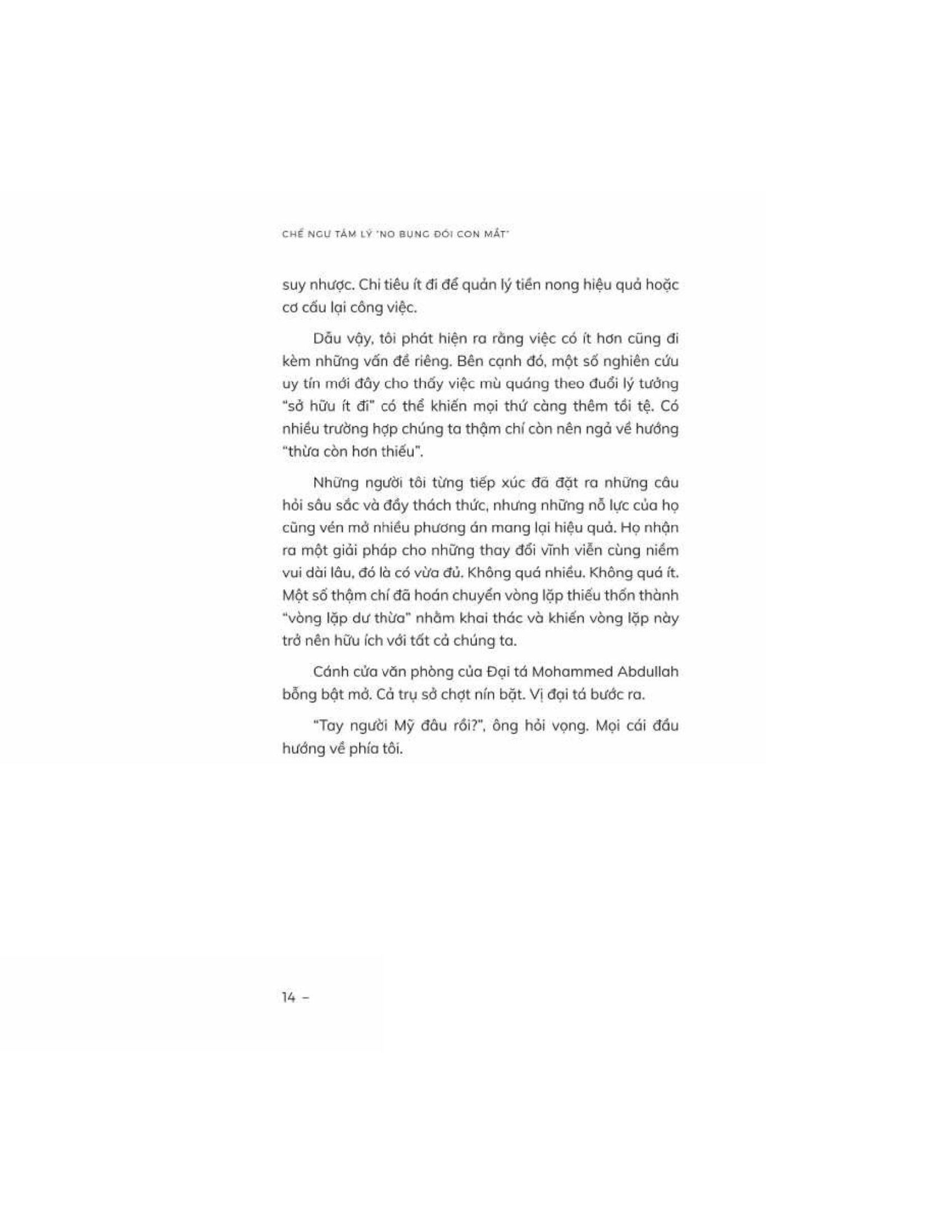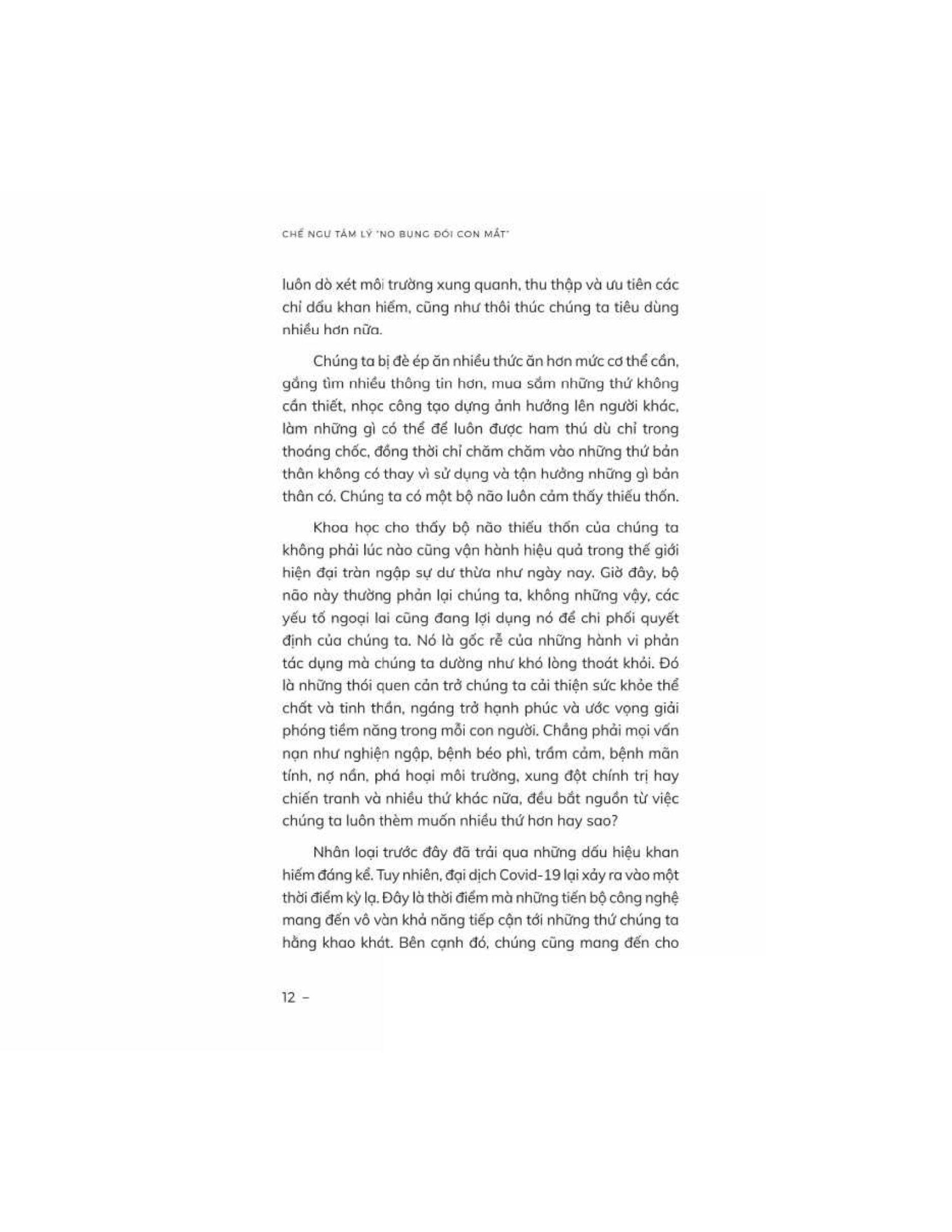 Chế Ngự Tâm Lý “No Bụng Đói Con Mắt” Thế giới đang dần trở nên quá tải với những thứ mà chúng ta luôn khao khát. Trong một thế giới tràn ngập ham muốn và sự quyến rũ của nhiều thứ khác, chúng ta cần hiểu tại sao con người luôn mong muốn nhiều hơn, đồng thời từ bỏ những thói quen xấu và tận dụng những gì chúng ta đang có. Chế ngự tâm lý “no bụng đói con mắt" của Michael Easter đưa người đọc vào một hành trình kích thích tư duy để tìm hiểu sự phức tạp của tâm trí con người và lý do đằng sau những ham muốn vô độ của chúng ta. Easter khám phá khái niệm về tư duy khan hiếm, "vòng lặp thiếu thốn" - một chu kỳ liên tục khiến chúng ta mong muốn sở hữu nhiều hơn trong các khía cạnh khác nhau của cuộc sống, từ thực phẩm và của cải vật chất đến thông tin cũng như sức ảnh hưởng. Cuốn sách đi sâu vào khoa học đằng sau những ham muốn này, rút ra từ khoa học thần kinh, tâm lý học và nhân chủng học. Cuốn sách cũng đưa ra những phương pháp đơn giản giúp chúng ta hướng tới lối sống “vừa đủ”,, củng cố những thói quen lành mạnh và sống trọn vẹn cũng như trân trọng những gì m.ình có, bao gồm:
