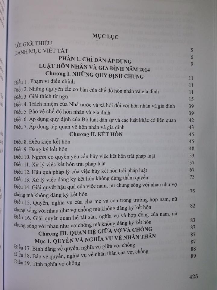 Mục lục: Chương 1: Những quy định chung Chương 2: Kết hôn Chương 3: Quan hệ giữa và chồng Chương 7: Cấp dưỡng Chương 8: Quan hệ hôn nhân và gia đinh có yếu tố