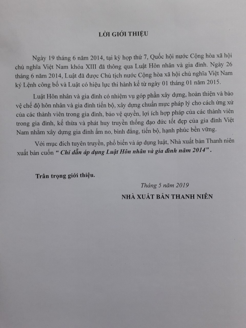 Ngày 19 tháng 6 năm 2014, tại kỳ họp thứ 7, Quốc hội nước Cộng hòa xã hội chủ nghĩa Việt Nam khóa XIII đã thông qua Luật Hôn nhân và gia đình. Ngày 26 tháng 6 năm 2014, Luật đã được Chủ tịch nước Cộng hòa xã hội chủ nghĩa Việt Nam ký Lệnh công bố và Luật có hiệu lực thi hành kể từ ngày 01 tháng 01 năm 2015. Luật Hôn nhân và gia đình có nhiệm vụ góp phần xây dựng, hoàn thiện và bảo vệ chế độ hôn nhân và gia đình tiến bộ, xây dựng chuẩn mực pháp lý cho cách ứng xử của các thành viên trong gia đình, bảo vệ quyền, lợi ích hợp pháp của các thành viên trong gia đình, kế thừa và phát huy truyền thống đạo đức tốt đẹp của gia đình Việt Nam nhằm xây dựng gia đình ấm no, bình đẳng, tiến bộ, hạnh phúc bền vững. Với mục đích tuyên truyền, phổ biến và áp dụng luật, Nhà xuất bản Thanh niên xuất bản cuốn Chỉ dẫn áp dụng Luật Hôn nhân và gia đình năm 2014 Nội dung cuốn sách gồm 2 phần như sau: Phần 1. Chỉ dẫn áp dụng luật hôn nhân gia và đình năm 2014. Phần 2. Các văn bản hướng dẫn luật hôn nhân gia đình
