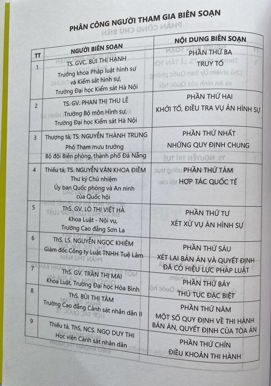 Cuốn sách gồm 9 phần, 510 điều, quy định trình tự, thủ tục tiếp nhận, giải quyết nguồn tin về tội phạm, khởi tố, điều tra, truy tố, xét xử và một số thủ tục