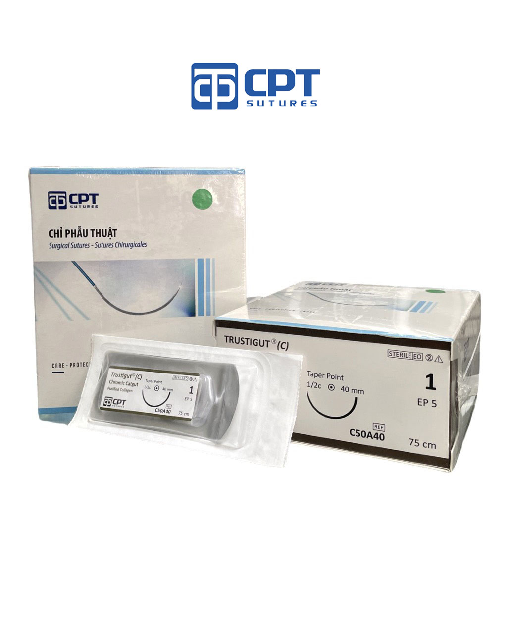 Mua tại TiktokChỉ phẫu thuật tự tiêu tan chậm CPT Trustigut (C) Chromic Catgut: size cỡ chỉ: số 1 USP, dài 75 cm, kim tròn 1/2c, dài 40 mm, mã hàng: C50A40. Quy cách đóng gói: 24 tép. THÀNH PHẦN: