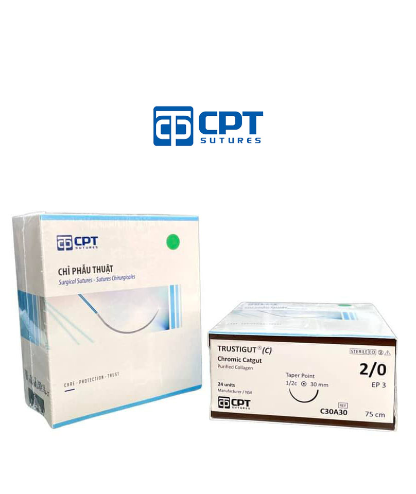 Chỉ phẫu thuật tự tiêu tan chậm CPT Trustigut (C) Chromic Catgut: size cỡ chỉ: 2/0 USP, dài 75 cm, kim tròn 1/2c, dài 30 mm, mã hàng: C30A30. Quy cách đóng gói: 24