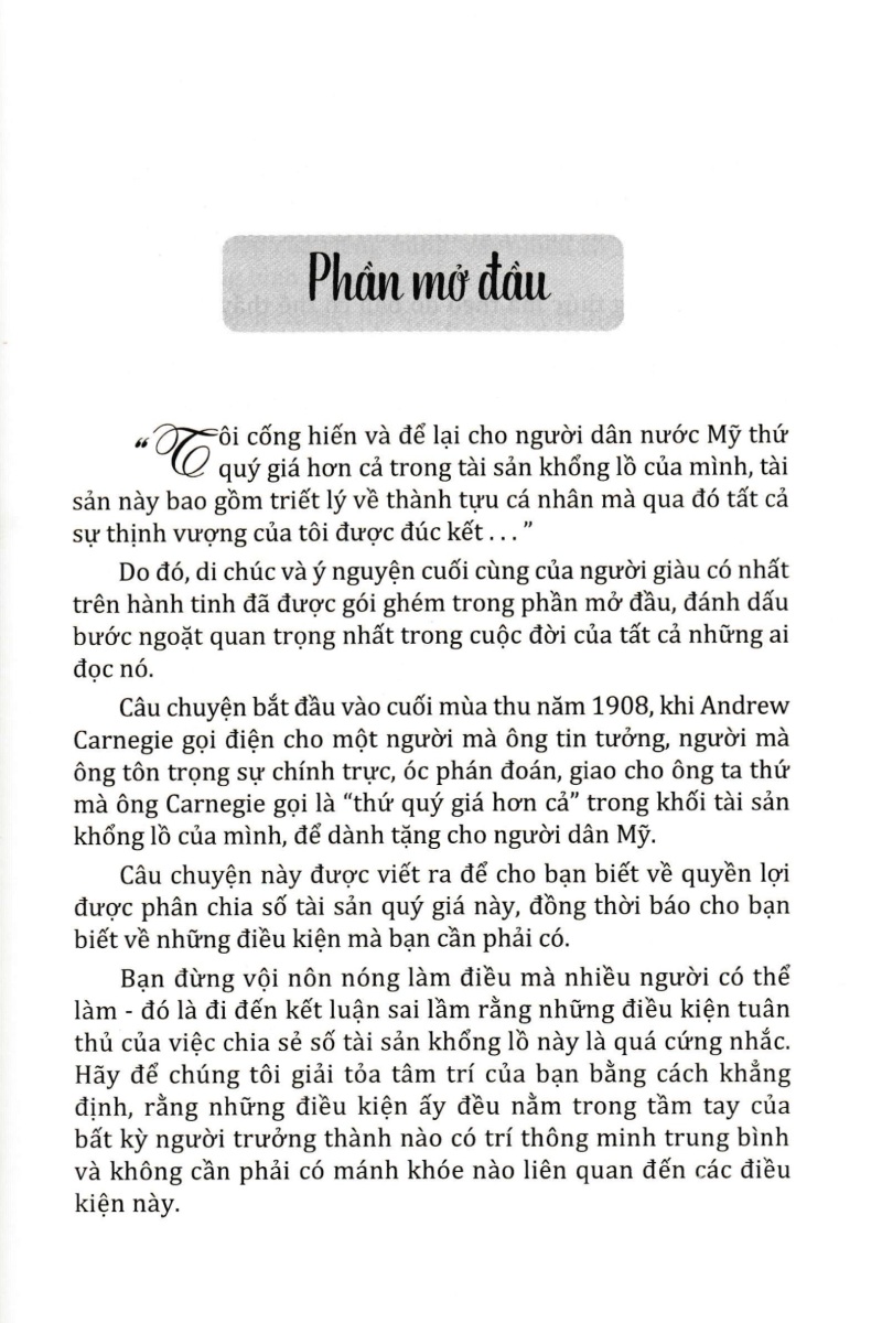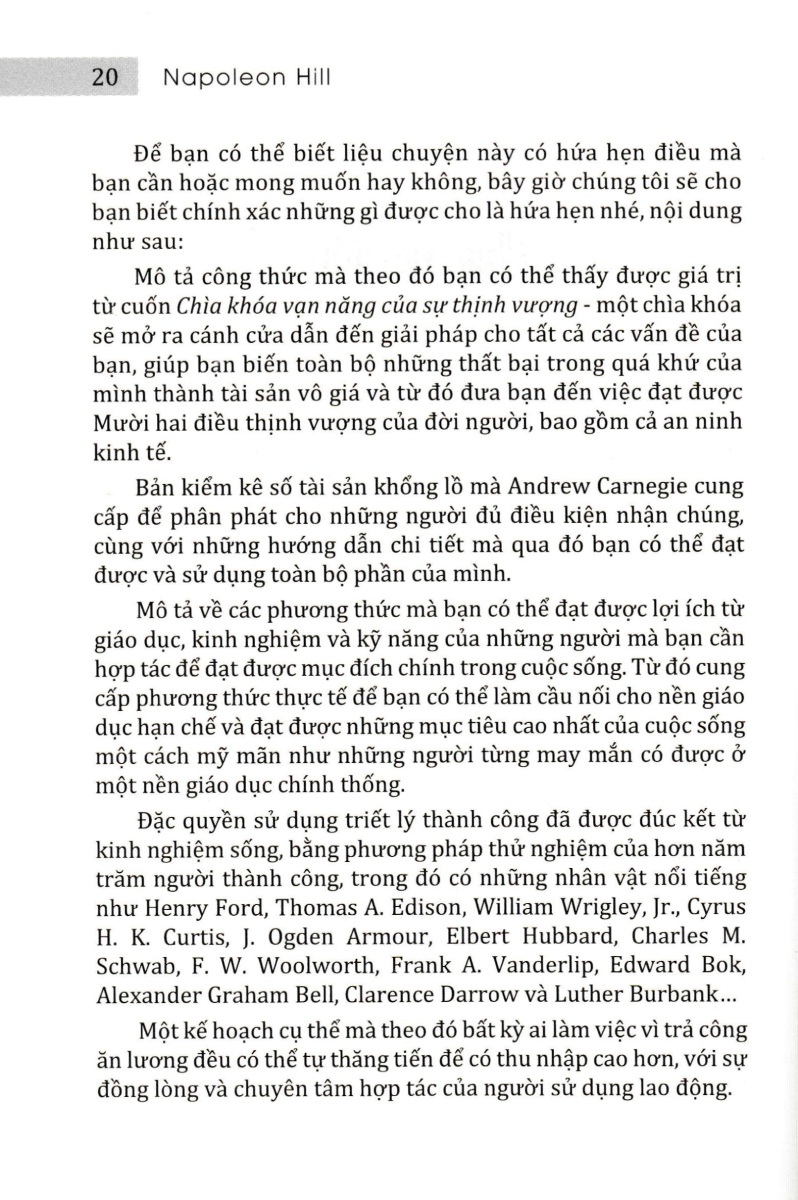 Khi còn là một phóng viên 25 tuổi của tạp chí Thành công, Napoleon Hill đã được cử đi phỏng vấn người giàu nhất ở nước Mỹ: ông trùm ngành thép Andrew Carnegie. Và ngay trong buổi phỏng vấn đó, Carnegie đã đề nghị chia cho Hill phần lớn tài sản của ông. Đó không phải là tiền bạc mà là sự thông thái mà ông tích lũy được về cách bất kì ai cũng có thể trở nên giàu có.