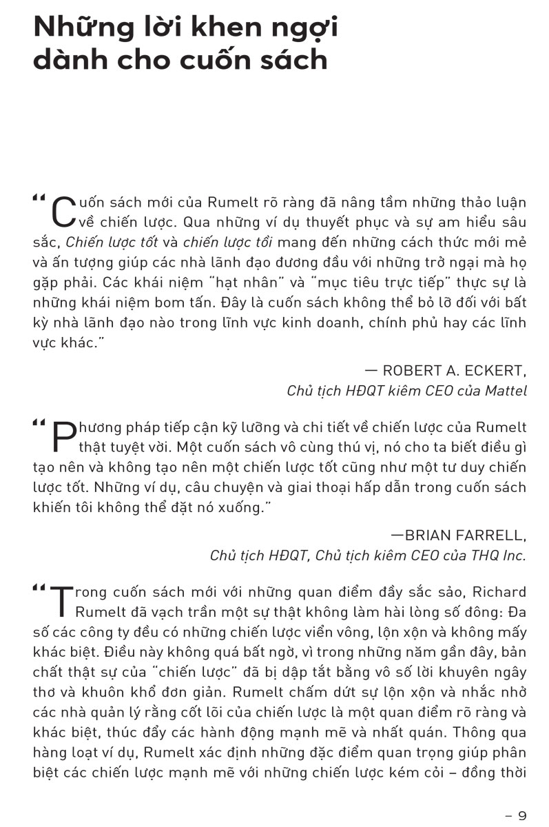 Trong Chiến Lược Tốt Và Chiến Lược Tồi, Richard Rumelt đã định nghĩa một cách chính xác về “chiến lược”, chỉ ra những lầm tưởng của thế giới hiện đại về thuật ngữ đang được sử dụng một cách bừa bãi này. Thông qua những ví dụ được nghiên cứu kỹ lưỡng suốt hàng thập kỷ, từ câu chuyện của Apple, Wal-Mart, General Motors đến cuộc khủng hoảng tài chính 2008, Chiến tranh Vùng vịnh hay Thế chiến thứ nhất,... ông vạch trần những yếu tố khiến các nhà lãnh đạo rơi vào cái bẫy của “chiến lược tồi” và phân tích sức mạnh to lớn của một “chiến lược tốt”.
