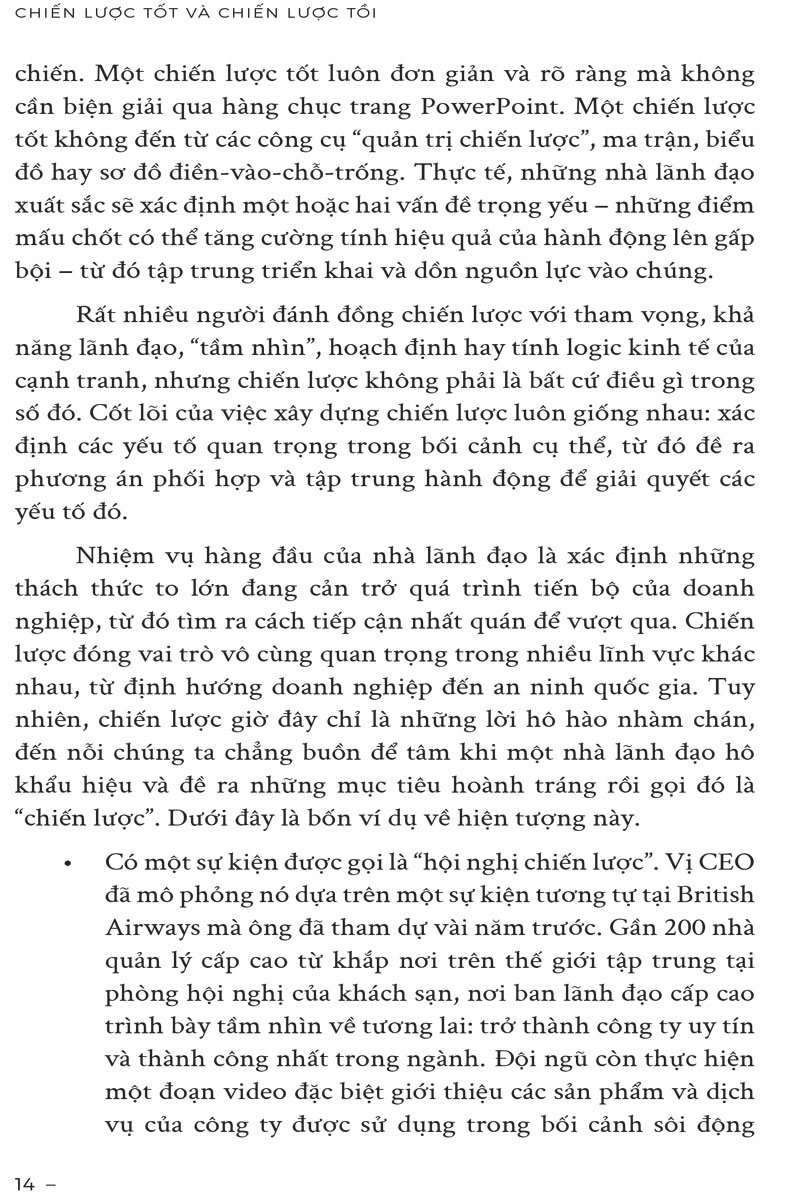 Khoảng cách giữa chiến lược tốt và mớ bòng bong của những thứ mà người ta gọi là “chiến lược” ngày càng lớn dần theo năm tháng. Cuốn sách này ra đời nhằm “thức tỉnh” chúng ta về sự khác biệt to lớn giữa chiến lược tốt và chiến lược tồi, đồng thời giúp các nhà lãnh đạo cải thiện khả năng xây dựng chiến lược tốt.