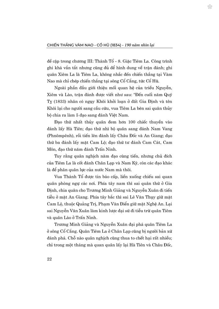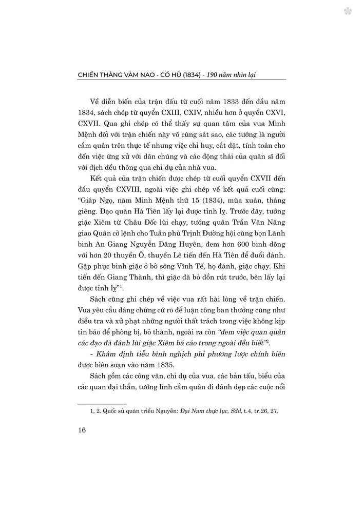 Nhằm góp phần làm rõ giá trị và ý nghĩa lịch sử của Chiến thắng Vàm Nao - Cổ Hũ trong lịch sử dân tộc Việt Nam, khơi dậy và phát huy tinh thần yêu nước, tinh thần tự hào, tự tin và tự chủ của dân tộc trong giai đoạn phát triển mới của đất nước, Nhà xuất bản Chính trị quốc gia Sự thật xuất bản cuốn sách Chiến thắng Vàm Nao - Cổ Hũ (1834) - 190 năm nhìn lại.