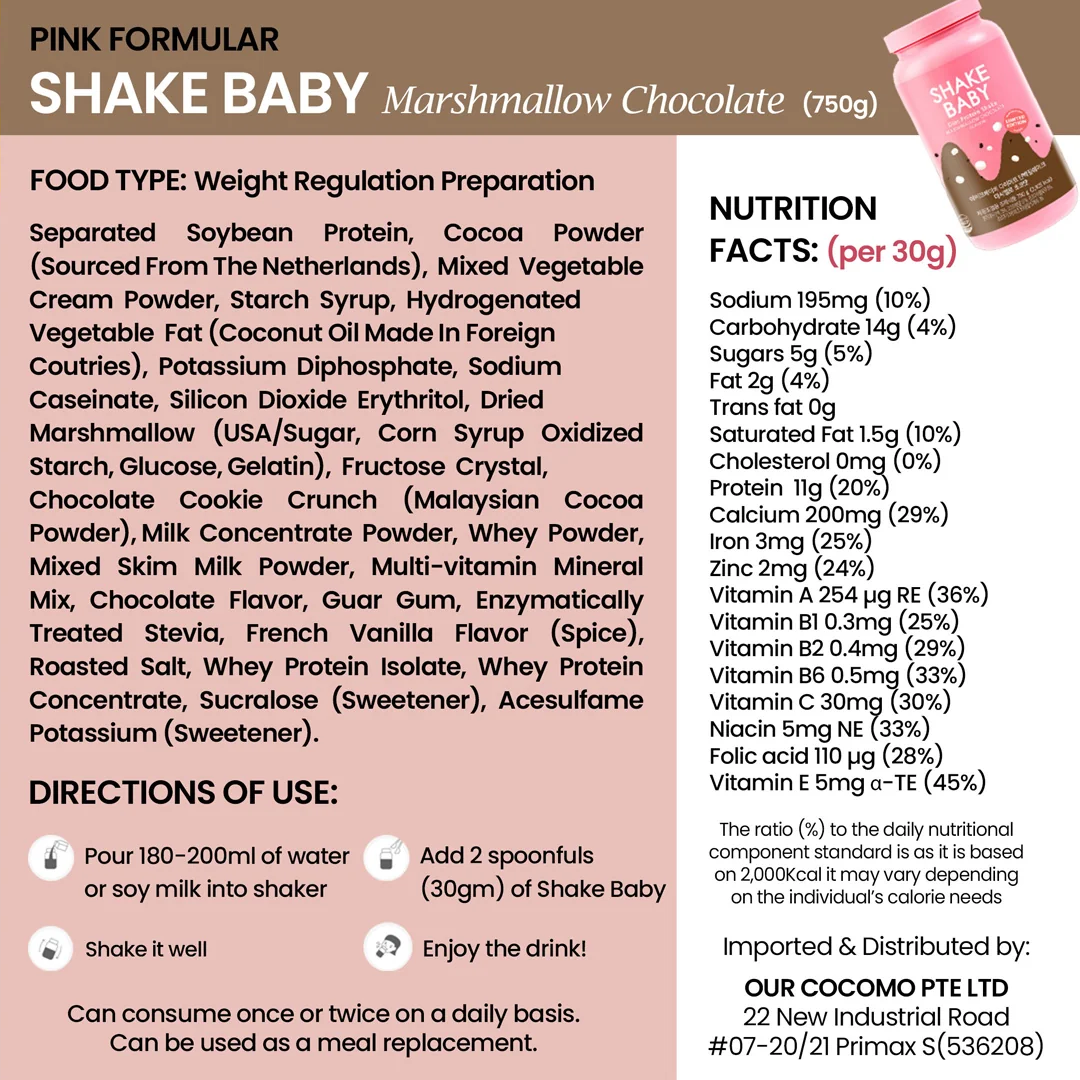 Bột Ngũ Cốc Ăn Kiêng Thay Thế Bữa Ăn Diet Formular Protein Shake Baby Vị Socola Kẹo Dẻo ( Marshmallow Chocolate Flavor) Dung tích: Dạng hộp 750g Thương hiệu: Shake Baby Xuất xứ: Hàn Quốc Bột ngũ cốc protein Shake Baby là sản phẩm mang tới công thức hiệu quả trong việc kiểm soát cân nặng, hay đặc biệt còn có thể cung cấp, bổ sung năng lượng như một bữa ăn mà vẫn giúp cơ thể có được lượng dinh dưỡng cần thiết. Bột ngũ cốc protein Shake Baby là dòng sản phẩm được yêu thích và tiêu thụ nhiều nhất Best & Steady tại "xứ sở Kim Chi". ️ ĐẶC ĐIỂM NỔI BẬT CỦA SHAKE BABY 750G - Đa dạng với 10 hương vị thơm ngon phù hợp với khẩu vị của từng khách hàng. - Dinh dưỡng cân bằng (9 loại axit amin, 11 loại vitamin & khoáng chất). - 25% vitamin & khoáng chất trở lên mỗi ngày.