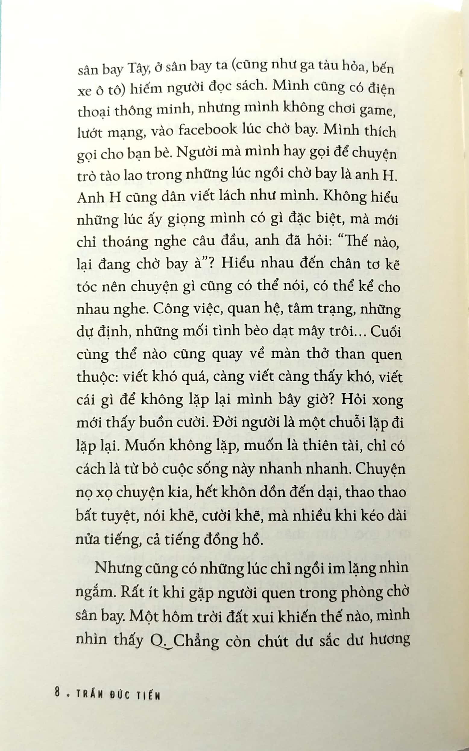 Tên của một vùng đất “ngân nga” trong lòng ông, “nghe yêu như âm hưởng dịu dàng thốt ra từ miệng người đẹp”. Đi nhiều, biết nhiều là niềm vui, là hạnh phúc, nhưng “chưa đi đường còn đó… lúc nào chẳng đang ở trên đường? Cuộc đời của mỗi người luôn là cuộc hành hương dằng dặc đến miền vô tận”. Ít người như Trần Đức Tiến, biết tận hưởng niềm an lạc trong những phút chờ bay, thả tâm hồn bay theo những số phận. Rồi ý thức được hạnh phúc nằm ngay trong từng bước chân, chứ không phải ở cái đích cuối chặng đường. Cô chủ quán xinh đẹp kiệm lời, không cần hỏi vẫn đem đến cho ông ly cà phê ưa thích, đủ để ông hàm ơn cuộc đời với món quà vô giá. Đến ngay cả những khoản vay mượn nợ nần, với ai kia là nhiêu khê, phiền phức, nhưng với Trần Đức Tiến: “Sạch nợ thì còn ở lại cõi trần gian này làm gì? Cho nên mình rất sợ những người không nợ nần ai điều gì cả”…