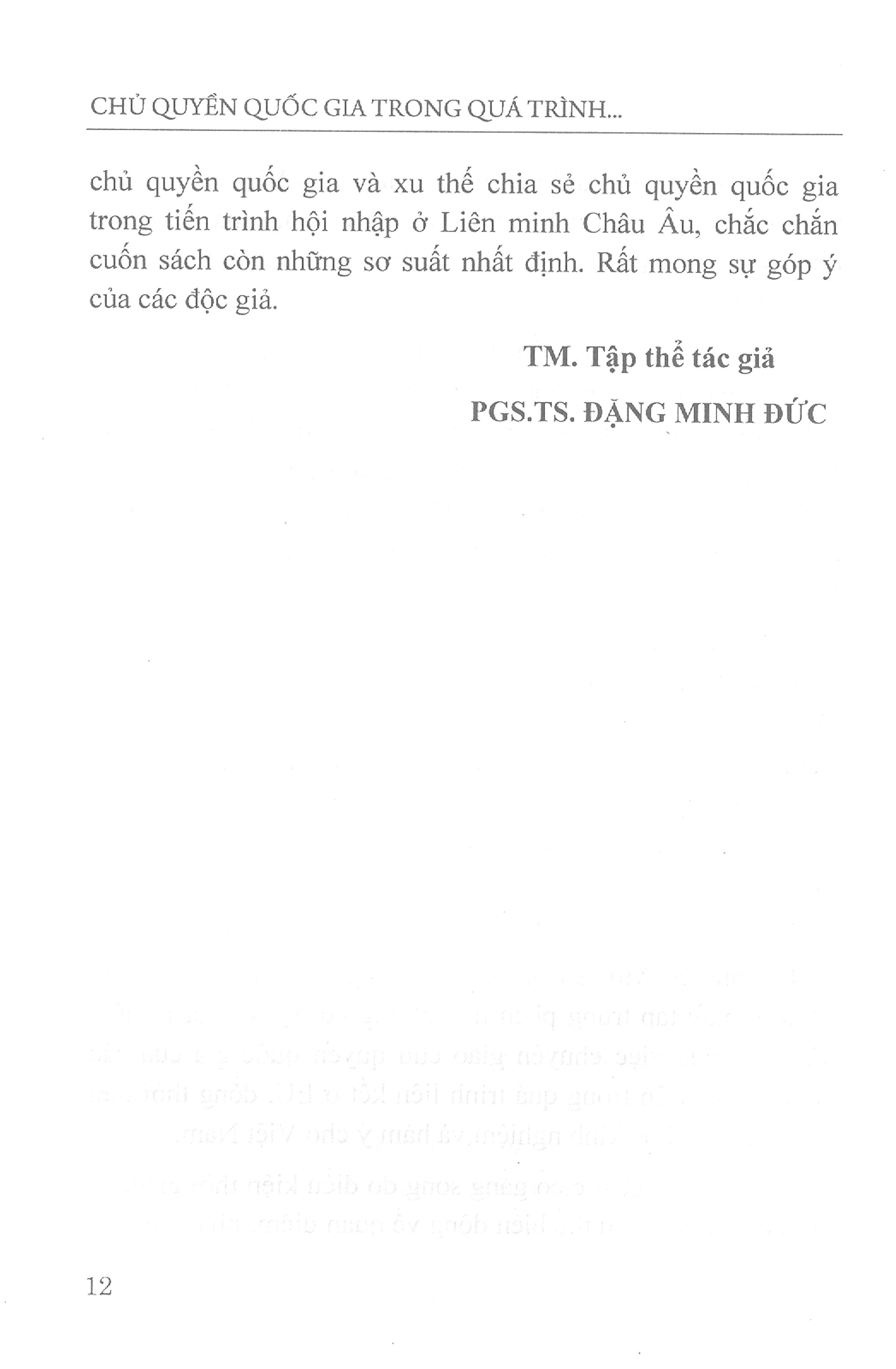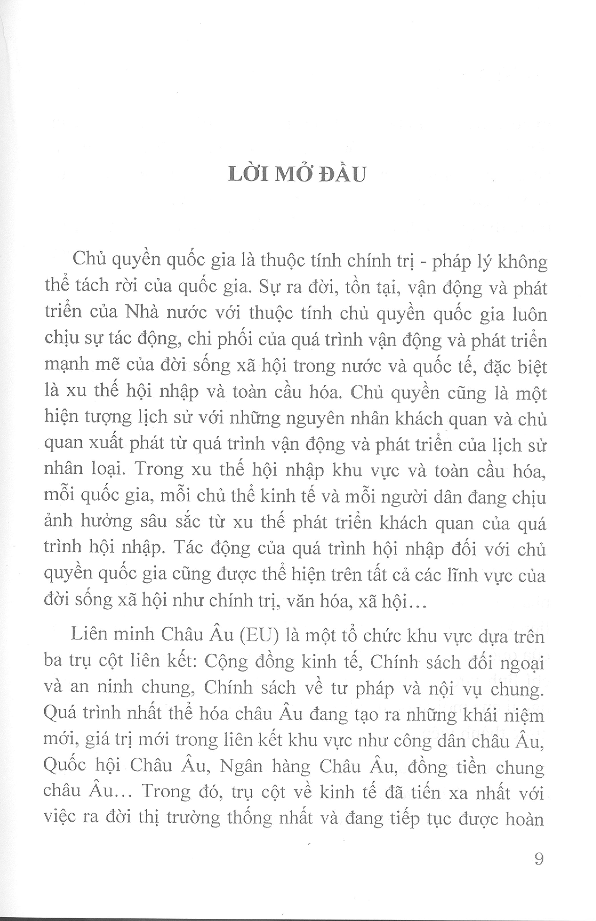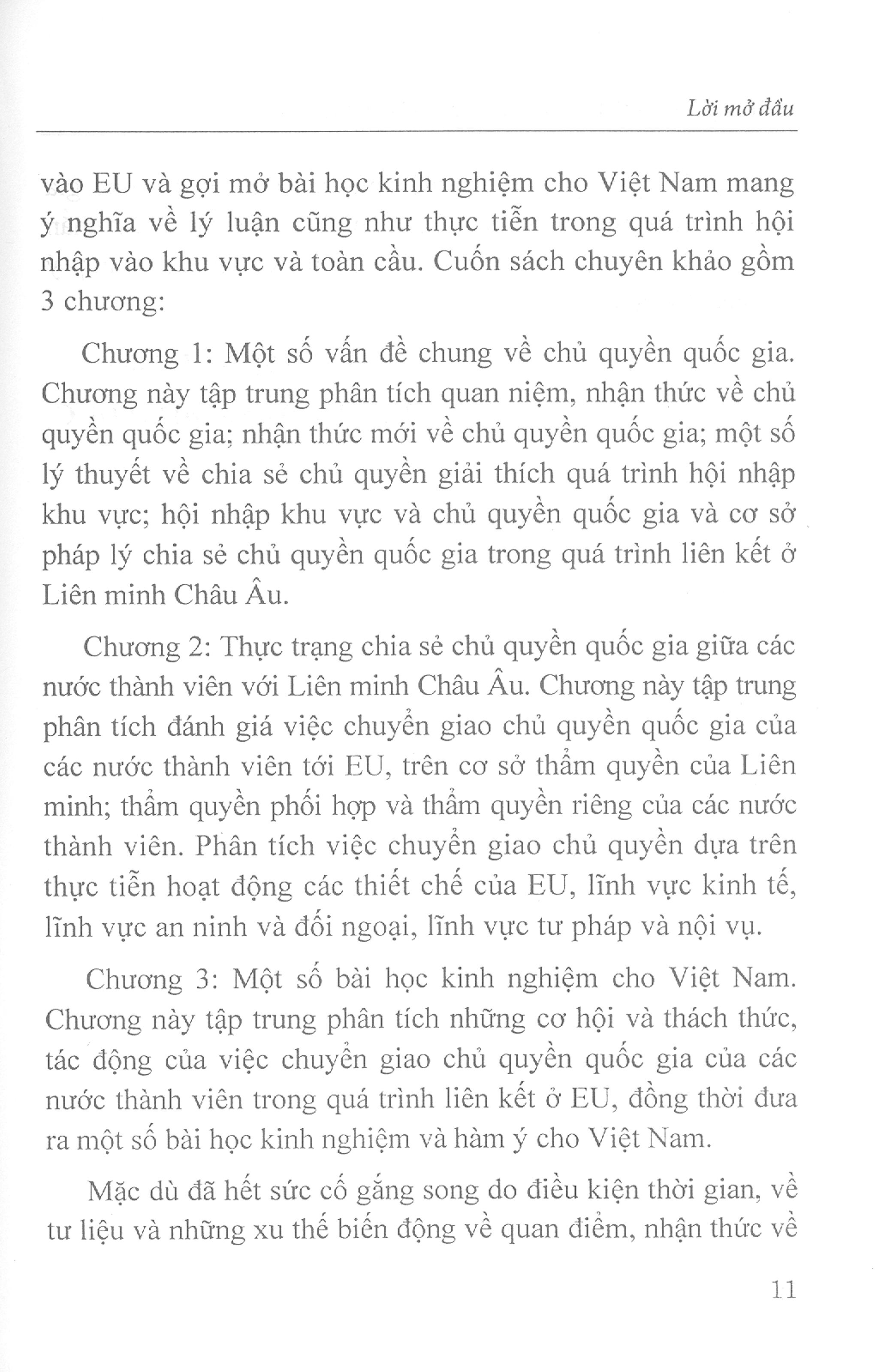 Chương 1: Một số vấn đề chung về chủ quyền quốc gia. Chương này tập trung phân tích quan niệm, nhận thức về chủ quyền quốc gia; nhận thức mới về chủ quyền quốc gia; một số lý thuyết về chia sẻ chủ quyền giải thích quá trình hội nhập khu vực; hội nhập khu vực và chủ quyền quốc gia và cơ sở pháp lý chia sẻ chủ quyền quốc gia trong quá trình liên kết ở Liên minh Châu Âu.