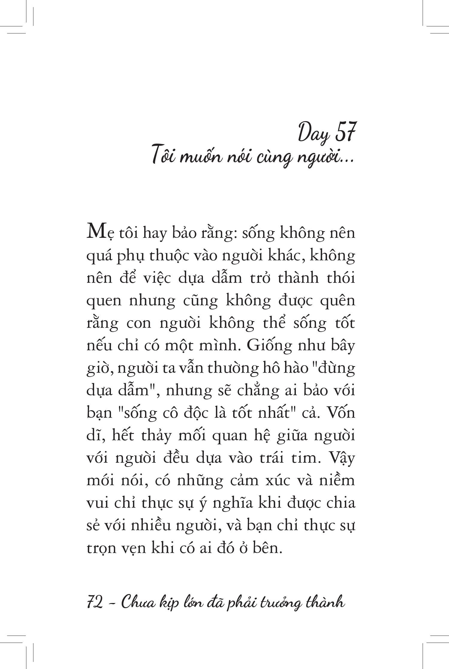 Nếu bạn đang trải qua giai đoạn lạc lõng và cô đơn như vậy, hãy để “Chưa kịp lớn đã phải trưởng thành” làm một người bạn ở bên, xoa dịu tổn thương và gửi tặng bạn đôi điều khích lệ. Mỗi trang sách đều là một lá thư nhắn nhủ bạn về sự đặc biệt của bản thân, về những nỗ lực hoàn thiện không ngừng nghỉ trong thế giới của người trưởng thành.