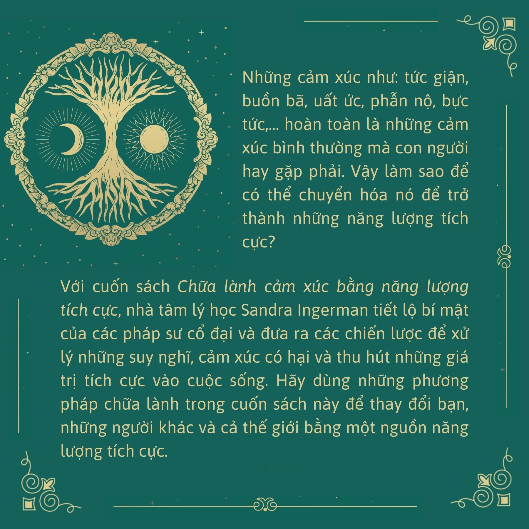 Với cuốn sách Chữa lành cảm xúc bằng năng lượng tích cực, nhà tâm lý học Sandra Ingerman tiết lộ cho chúng ta những công cụ nhằm đối phó với sự tức giận, sợ hãi, thất vọng và đưa ra các chiến lược để xử lý những suy nghĩ, cảm xúc có hại, thu hút những giá trị tích cực vào cuộc sống. Hãy dùng những phương pháp chữa lành trong cuốn sách này để thay đổi bạn, những người khác và cả thế giới bằng một nguồn năng lượng tích cực hơn bạn nhé!
