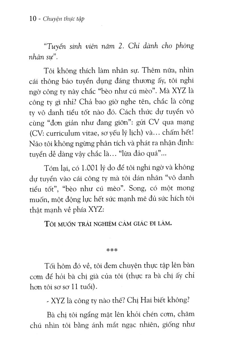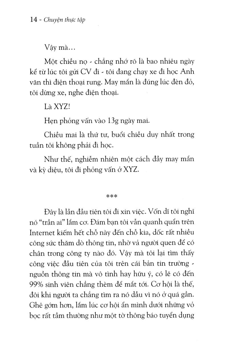 Bạn trẻ sẽ xoay xở thế nào với cái lịch dày đặc giữa công ty - giảng đường - lớp học ngoại ngữ buổi tối? Với những câu chuyện rất dung dị và đời thường từ Mai Anh, các bạn đang và sẽ đi thực tập sẽ có thêm nhiều kinh nghiệm quý báu, có một cái nhìn thực tế hơn về việc đi làm tại một công ty. Bạn đọc đã đi qua quãng đời thú vị này cũng sẽ bắt gặp lại hình ảnh của chính mình, trong những ngày đầu chập chững từ nhà trường đến công ty qua hình ảnh của cô thực tập sinh Mai Anh.