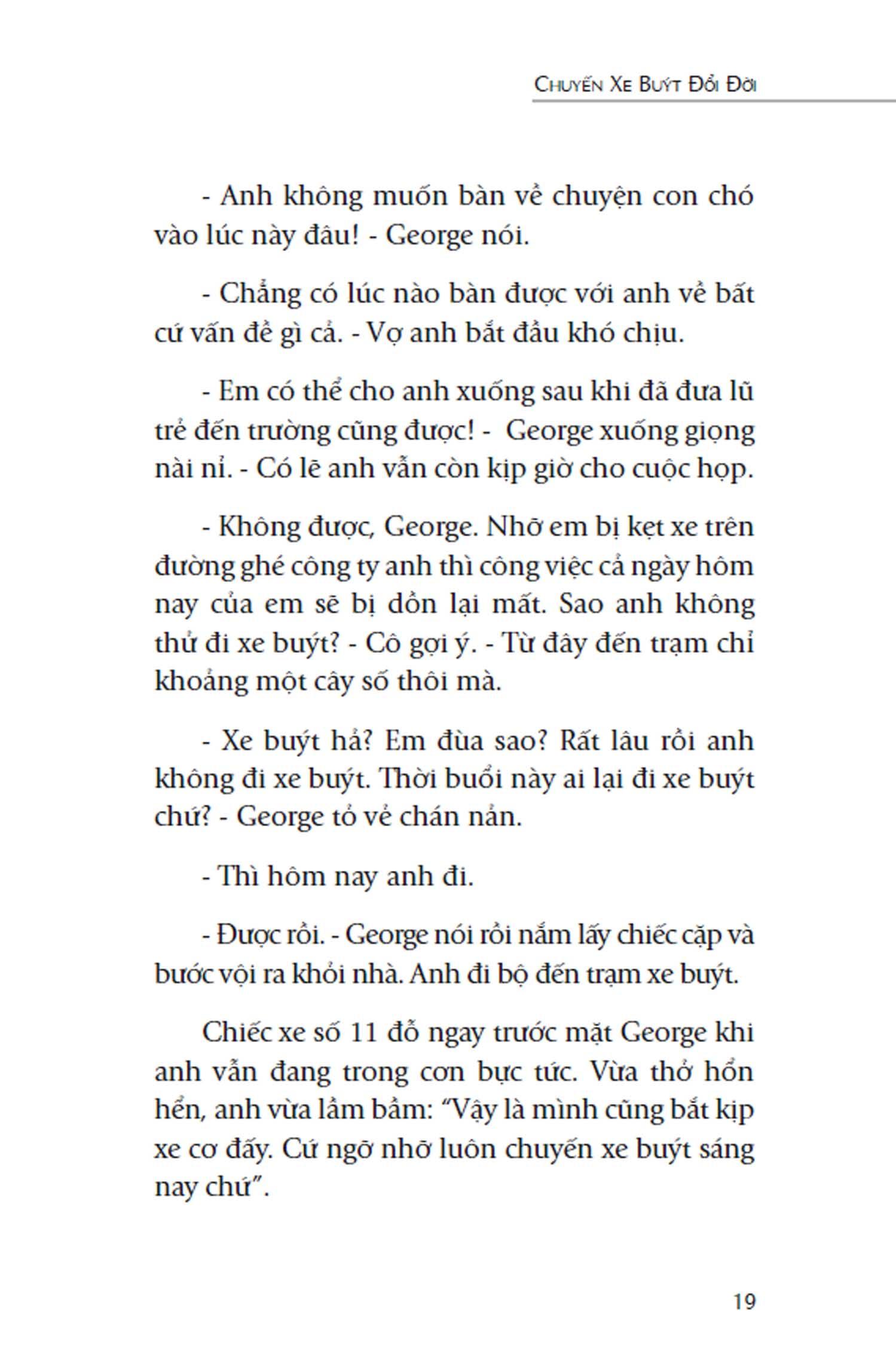 Trong sách, bạn sẽ theo chân George trải qua hàng loạt rắc rối, từ việc chiếc xe xẹp lốp, đứa con quấy khóc, cho đến những trở ngại lớn hơn trong sự nghiệp và hôn nhân. Những chuyện mà George trải qua cũng chính là những khó khăn mà chúng ta thường phải đối mặt trong cuộc sống. Ban đầu, anh đối diện với nó bằng thái độ cọc cằn, thù hằn và chán nản. Chính thái độ này làm cho cuộc sống của anh ngày càng trở nên khó khăn. Tuy nhiên, nhờ có Chuyến xe buýt đổi đời của Joy mà George đã nhận ra sai lầm, đồng thời thay đổi từng chút để lèo lái chiếc xe cuộc đời của m.ình theo hướng tích cực.