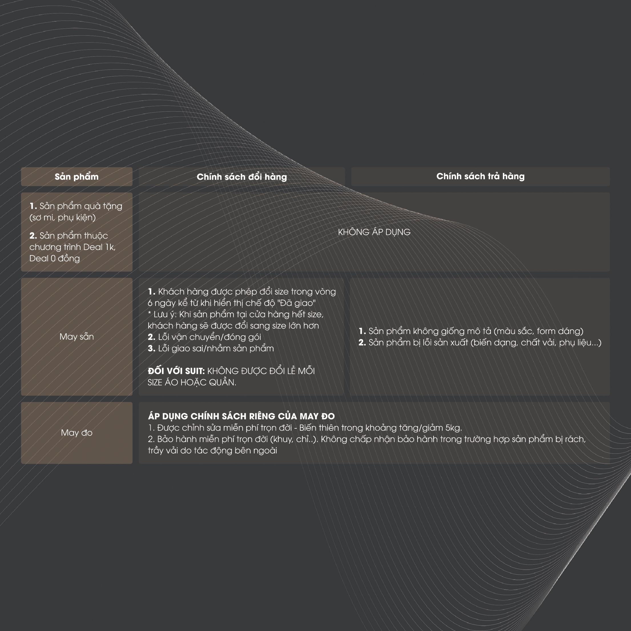 - Size: M L XL XXL (có bảng size cụ thể) • Một bộ suit bao gồm: