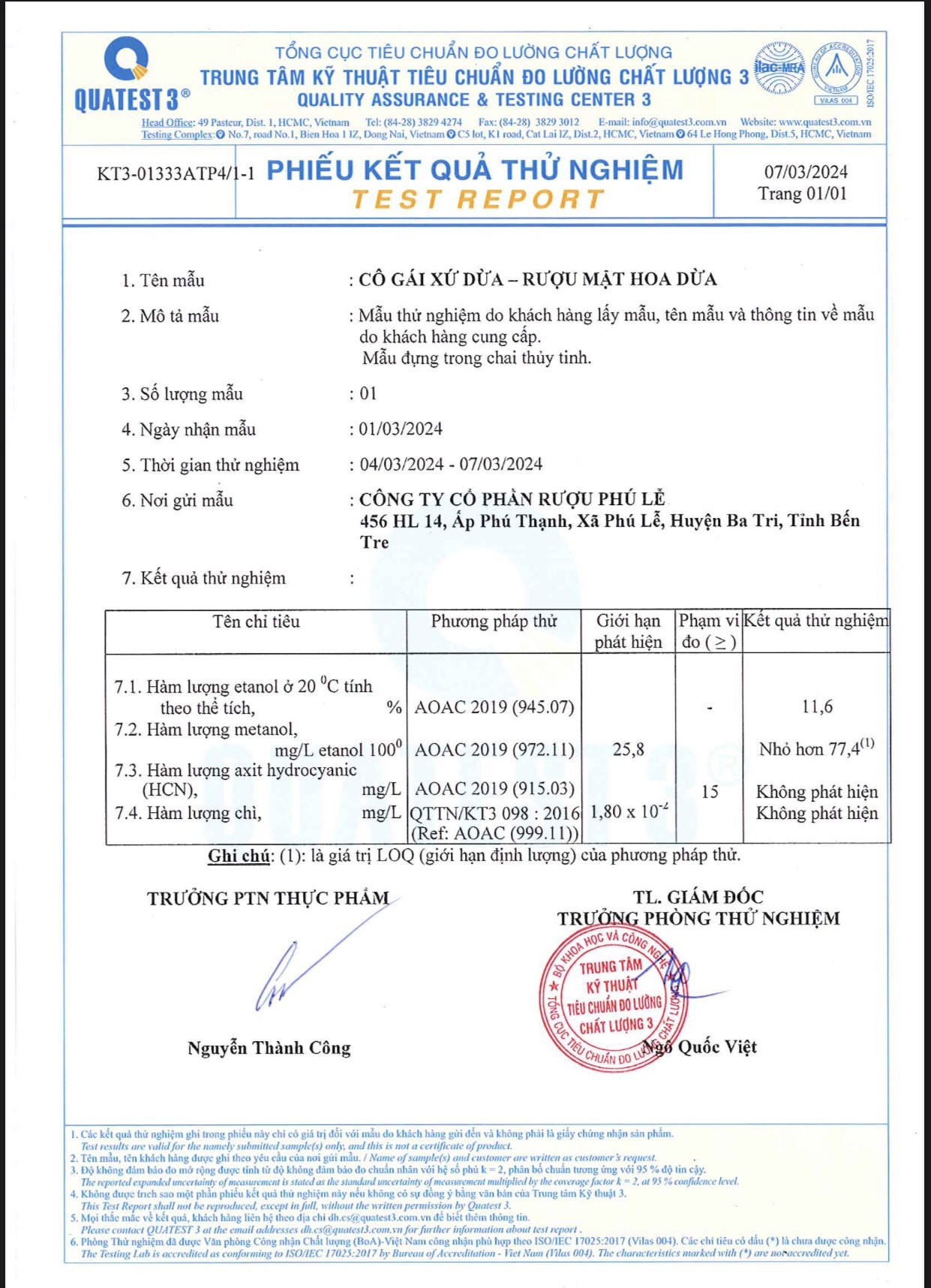 Cô Gái Xứ Dừa với thành phần từ mật hoa dừa lên men, mang đến cảm giác chua thanh, dịu ngọt. Sản phẩm phù hợp để uống khai vị và nhâm nhi trong lúc chuyện trò, Thành phần: rượu mật hoa dừa, syrup mía xanh Thể tích thực ở 20 độ C: 350ml Hàm lượng etanol: 12.5% Hướng dẫn sử dụng: dùng để uống, nên dùng với liều lượng thích hợp HSD: 12 tháng Bảo quản: nơi thoáng mát, không để gần nguồn nóng hoặc dưới ánh nắng trực tiếp; giữ lạnh sau khi mở nút và dùng hết trong 7 ngày Sản xuất và đóng chai duy nhất tại: CÔNG TY CỔ PHẦN RƯỢU PHÚ LỄ