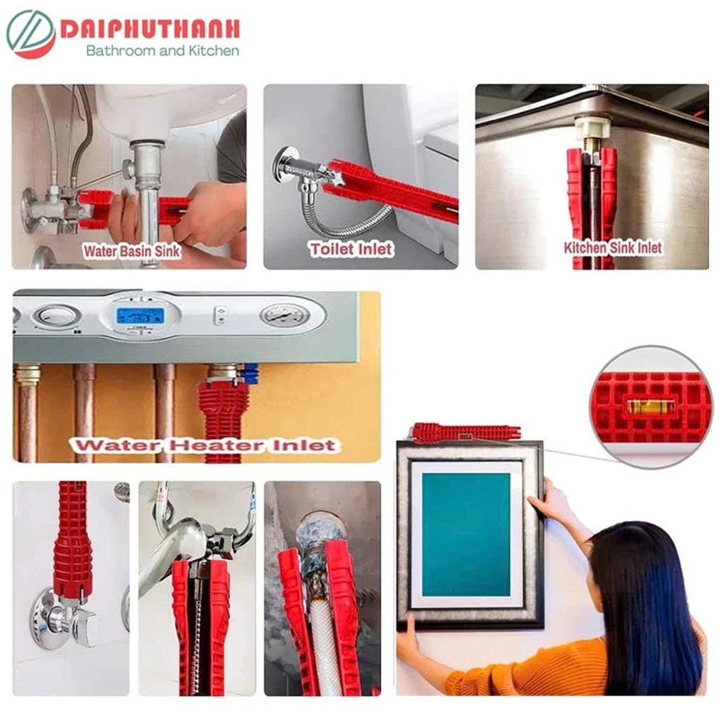 Cờ Lê Dụng Cụ Tháo Lắp Dây Cấp Van Nước Đa Năng Gồm 8 chức năng, với các bộ phận sau: - Phần thân (tay cầm nắm): bằng nhựa, thiết kế chắc chắn, chống trơn