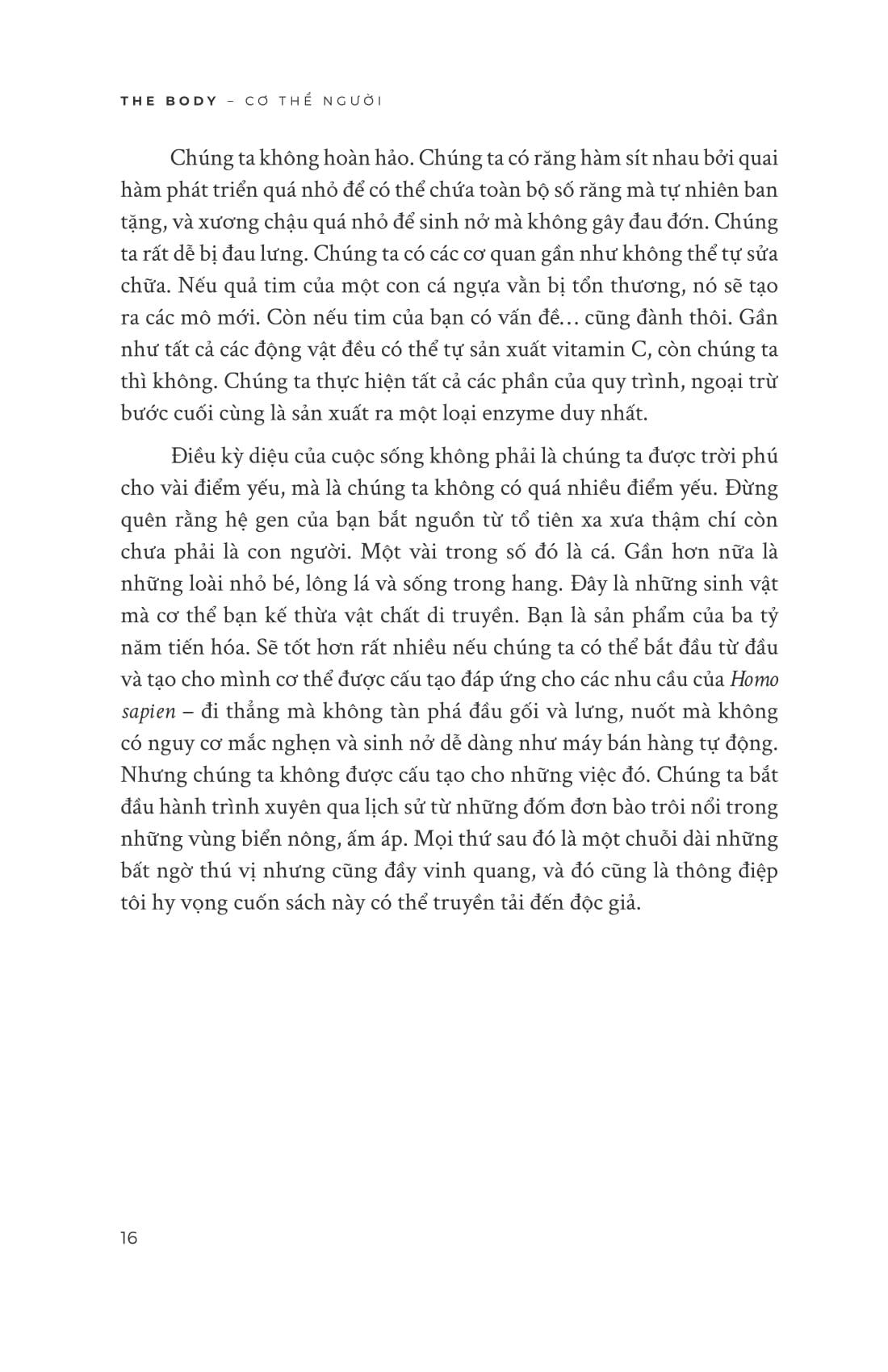 Với phong cách viết hóm hỉnh và dễ tiếp cận, Bryson không chỉ cung cấp kiến thức khoa học mà còn khơi gợi sự kinh ngạc và tôn vinh sự phức tạp, kỳ diệu của cơ thể con người, giúp người đọc cảm thấy gần gũi hơn với cơ thể của chính m.ình và đánh giá cao những gì mà cơ thể làm cho chúng ta mỗi ngày.