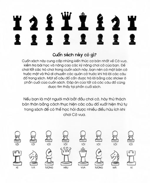 Bộ sách dễ dàng giúp ba mẹ giới thiệu cho trẻ một cách tổng quát nhất về các quân cờ cũng như vai trò của chúng trên bàn cờ. Các quân cờ vua đều có hình dáng riêng nên trẻ sẽ phân biệt khá dễ dàng.