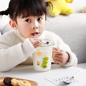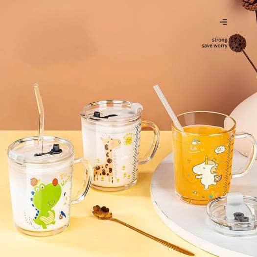 Cốc pha sữa, uống nước thủy tinh 400ml chia vạch cho bé có ống hút và nấp đậy chống tràn cho bé (mẫu ngẫu nhiên) - HENRYSA