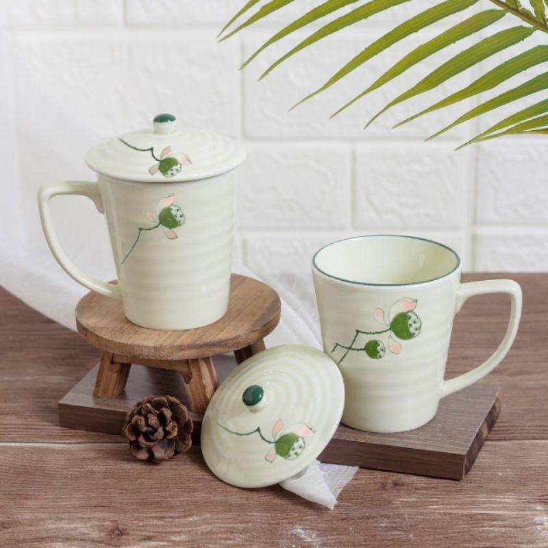 ✨Cốc sứ Bát Tràng có nắp vẽ hoa men kem
