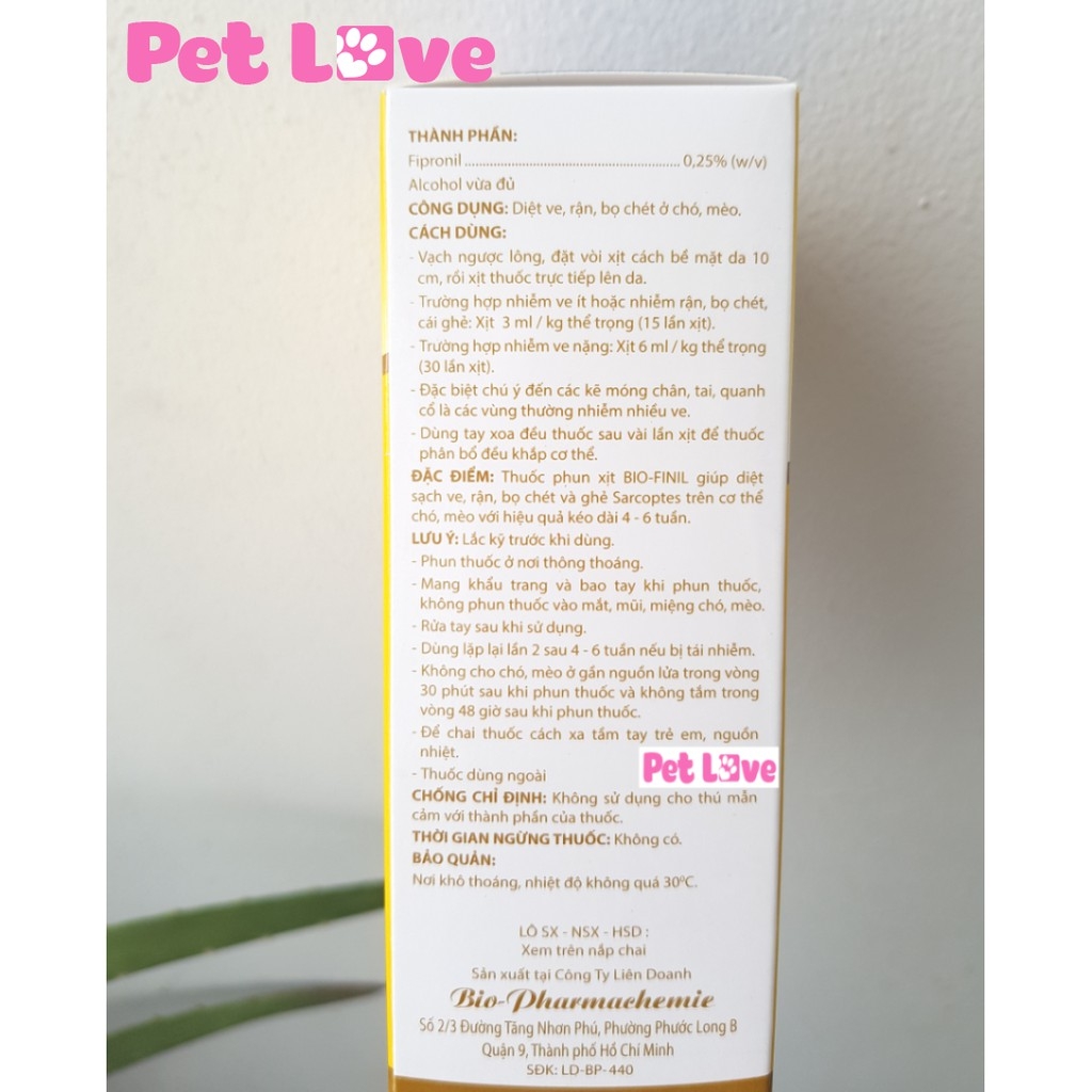 * Bio Finil diệt sạch ve rận, bọ chét, ghẻ Sarcoptes trên cơ thể chó, mèo. * Hiệu quả kéo dài 4 - 6 tuần. * Sản phẩm chính hãng của công ty Bio -
