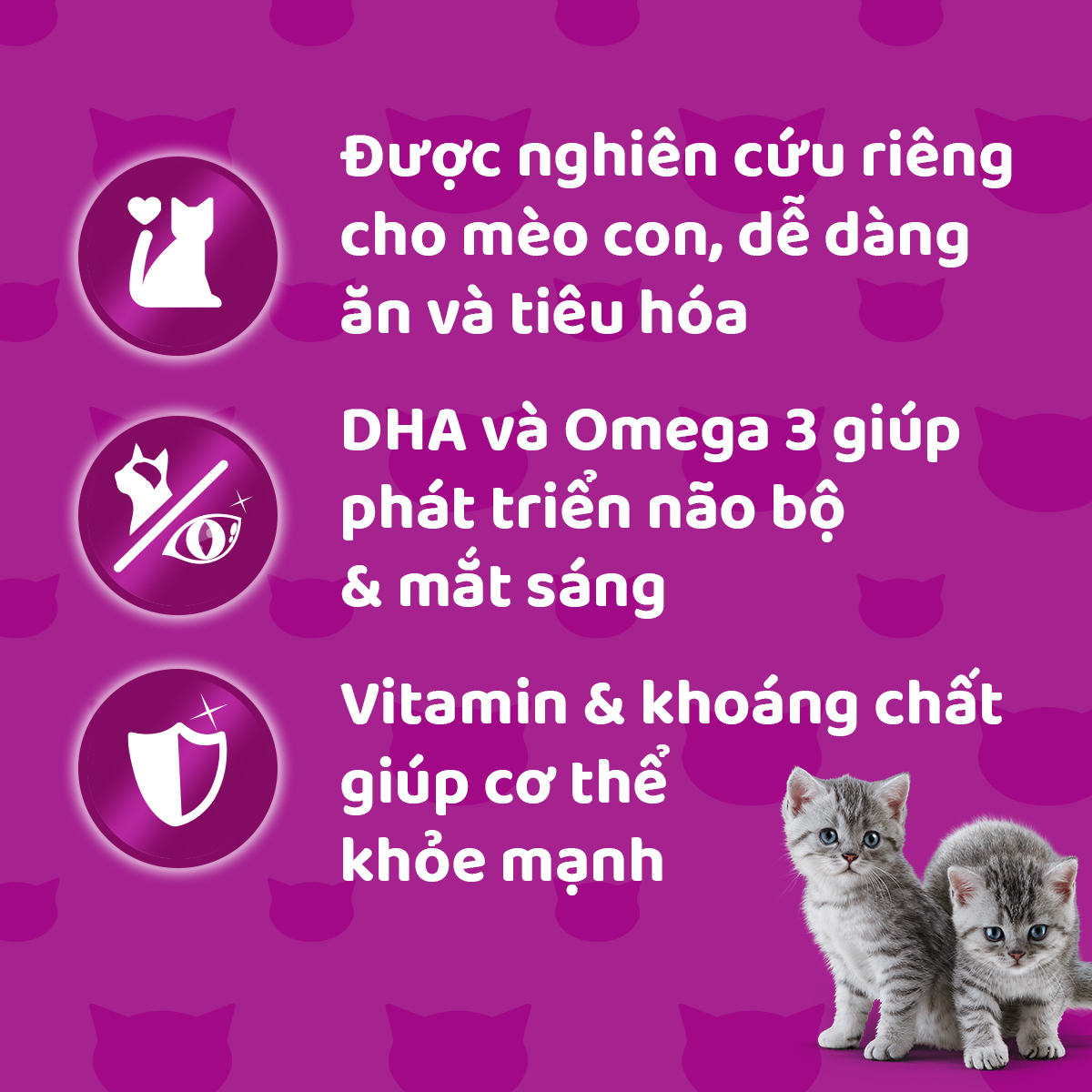 Các dưỡng chất cần thiết (bao gồm Canxi, Phốt pho và Vitamin D) giúp mèo con tăng trưởng khỏe mạnh với hệ răng và xương chắc khỏe