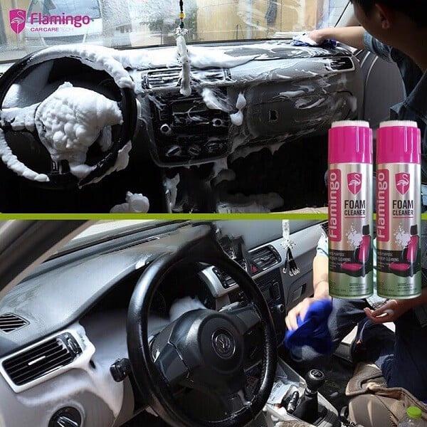 Combo xịt tẩy vệ sinh và dưỡng bóng nội thất ô tô, gia đình bao gồm 1 chai xịt tẩy dạng bọt Flamingo F002 và 1 chai dưỡng bóng hương cafe Flamingo F096