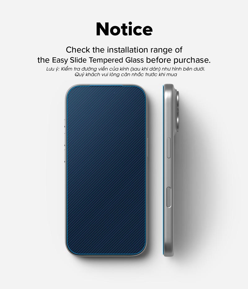 - Mua 1 được 2. Bộ sản phẩm gồm: 2 miếng dán cường lực, 1 khung Easy Slide hỗ trợ dán, 1 bộ kit dán. GIỚI THIỆU THƯƠNG HIỆU RINGKE Ringke là thương hiệu chất lượng ngành hàng phụ kiện công nghệ. Thành lập năm 2003 tại Hàn Quốc nên Ringke có nhiều kinh nghiệm về thiết kế và sản xuất. Các sản phẩm của Ringke được khách hàng đánh giá cao vì sử dụng nguyên liệu chất lượng tốt, thân thiện với môi trường và chức năng bảo vệ thiết bị tối ưu. Ngoài ra các dòng sản phẩm của Ringke cũng đạt được chứng nhận của Quân đội Mỹ (chuẩn MIL STD 810G 516,6). THÔNG SỐ KỸ THUẬT Tên sản phẩm: Ringke Easy Slide Tempered Glass Thương hiệu: Ringke / Sản xuất: Trung Quốc Dòng máy tương thích: iPhone 17 Pro Max / 17 Pro / 17 / Air Chất liệu: kính Vui lòng kiểm tra thiết bị và chọn dòng máy chính xác. Bạn có thể xem thông tin máy bằng cách: Nhấn chọn Cài đặt (Settings) => Chọn Giới thiệu điện thoại => Màn hình hiển thị thông tin của điện thoại, trong đó có cả tên thiết bị của bạn. LƯU Ý VỀ SẢN PHẨM Phần cạnh viền của kính sau khi dán sẽ như hình dưới đây, thiết kế này nhằm đảm bảo kính tương thích với ốp lưng. Quý khách vui lòng cân nhắc trước khi mua.