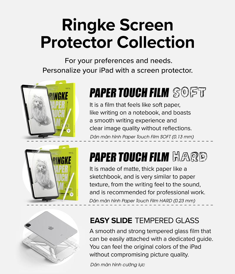 Dán màn hình iPad Pro 11″ M4/Pro 13" M4 RINGKE Paper Touch Film Ưu điểm sản phẩm - Mang lại cảm giác như đang viết trên giấy - Chất liệu PET, dán mềm giúp bảo
